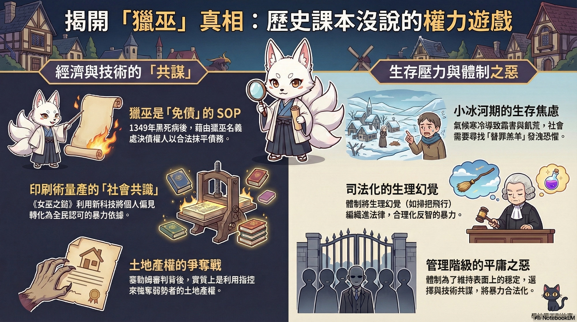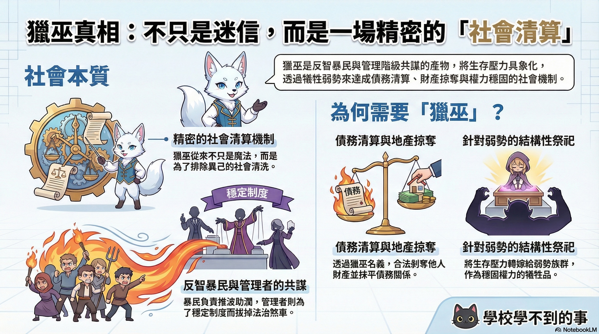 其本質在於:反智的暴民踩下了油門,而管理階級為了維持制度表面上的穩定,親手拔掉了剎車。 我們將從人類學視角出發,探討在不同的時空背景下,獵巫如何因應不同目的(債務清算、地產掠奪、權力穩固)而存在。這是一場關於生存壓力的具象化,也是一場針對弱勢族群的結構性肉體獻祭 。