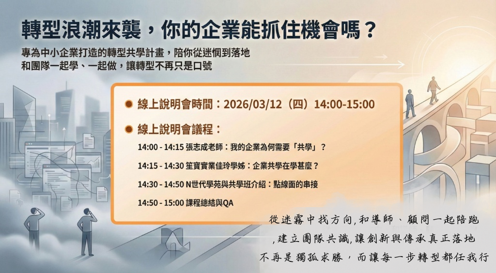 📌 本線上說明會將帶你快速掌握課程重點,為企業開啟一條不孤單、走得下去的轉型成長之路。