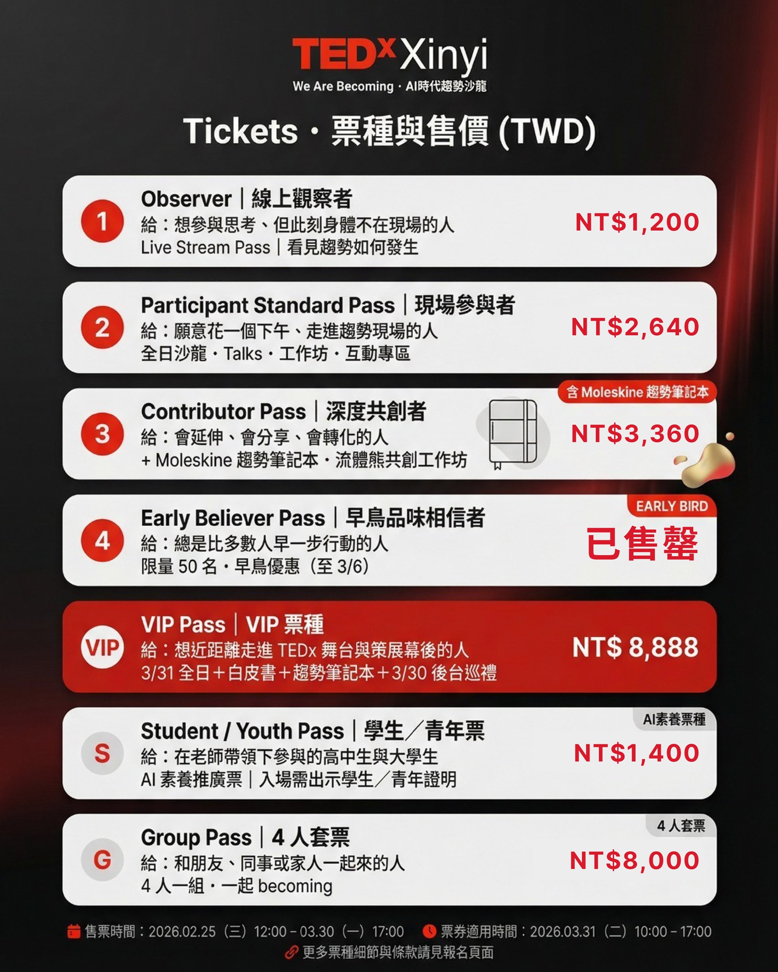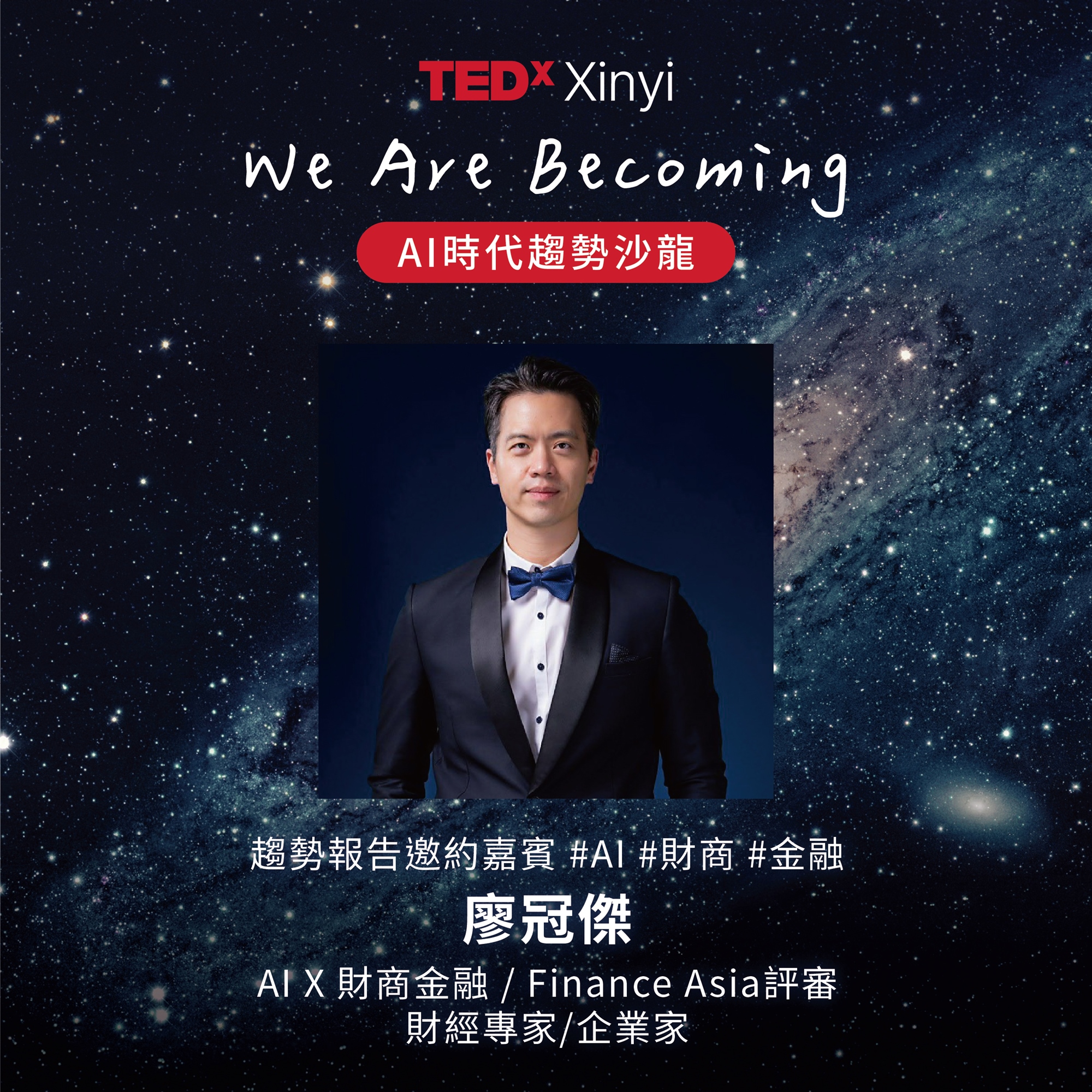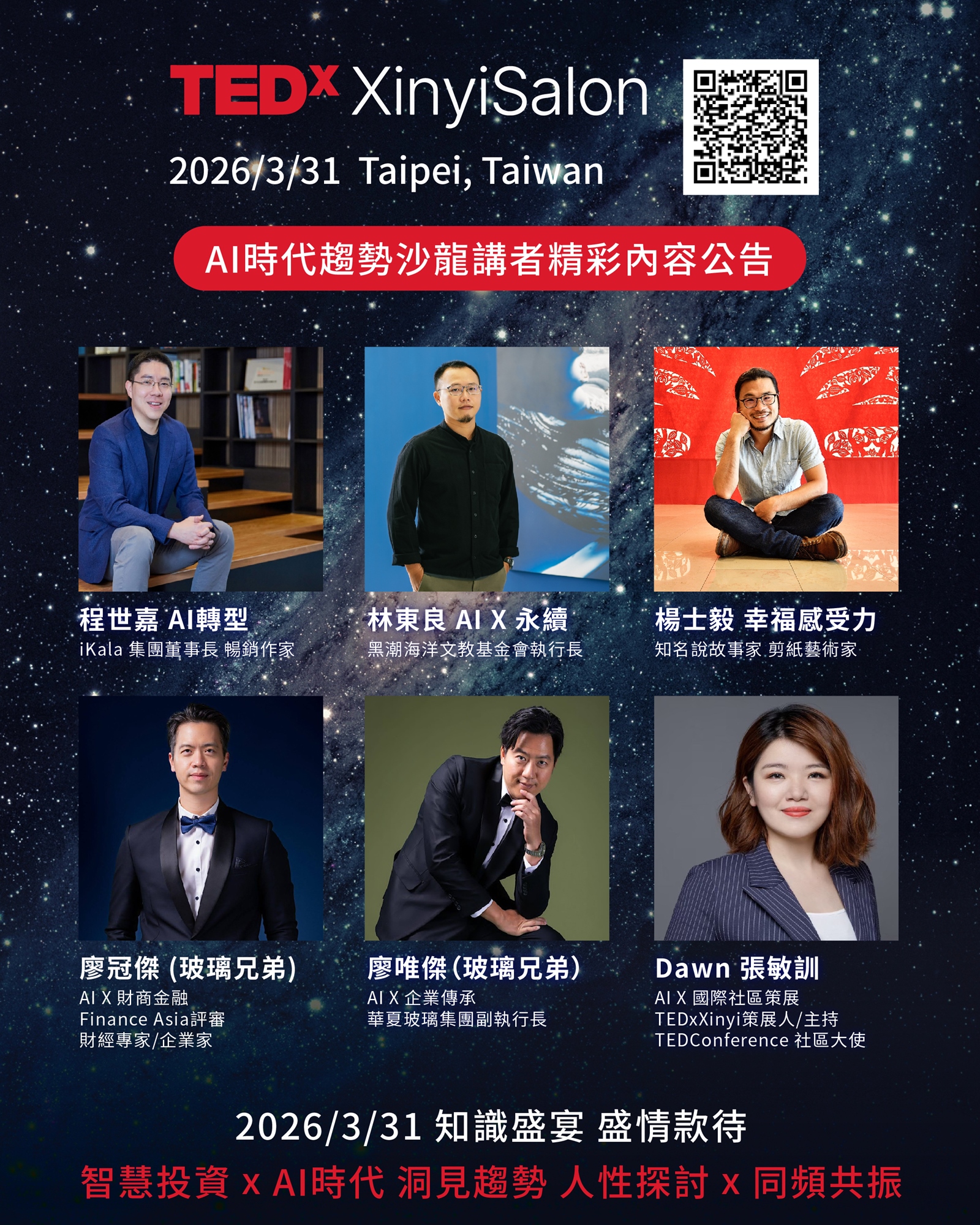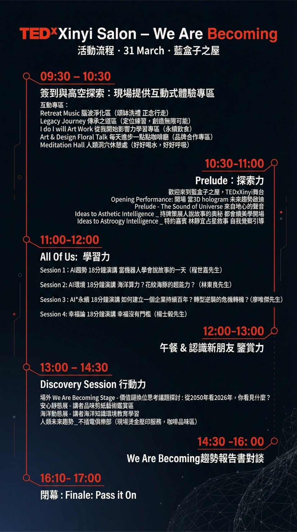 此次為了跟TEDConference最後一年在溫哥華舉辦致敬,主題是All Of Us,TEDxXinyi在地貫策Ideas Change Everything心意,在開春帶領大家進入一種未來的想像,值得一天投資自己來知識獲利。此次特別邀請跨界重量級講者分別演繹 AI時代,趨勢影響力演講,主題橫跨AI *企業治理 *永續環境 *AI跟人類的大比較,以及跟AI毫無相關的幸福沒有門檻,讓我們彼此一起交融。