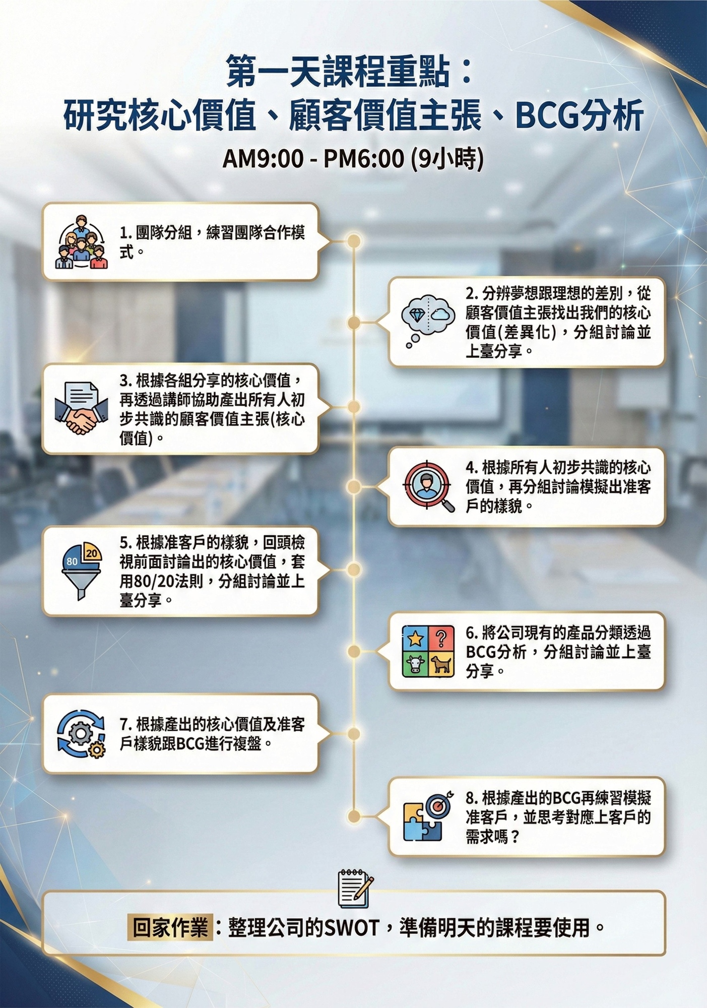 我們將帶領你從顧客價值主張出發,透過 BCG 矩陣、進化版 SWOT 與 BSC 戰略地圖,