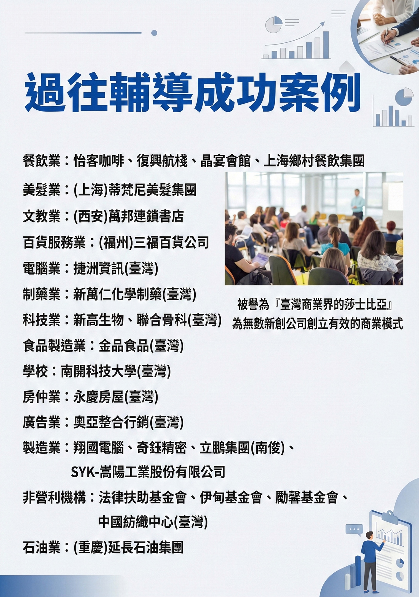 輔導對象涵蓋連鎖零售、美妝服務、餐飲集團及教育體系