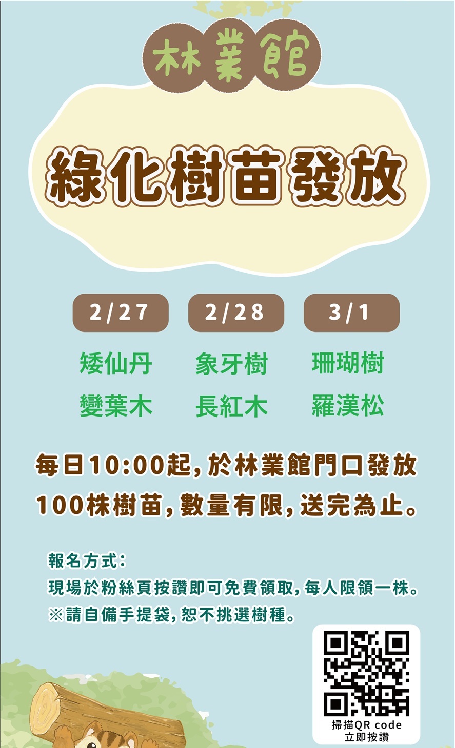 每日10:00起於林業館門口發放100株樹苗,送完為止。