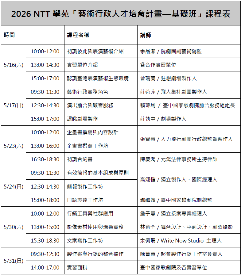 - 對象:年滿20歲,現職或未來有志從事表演藝術行政工作者。