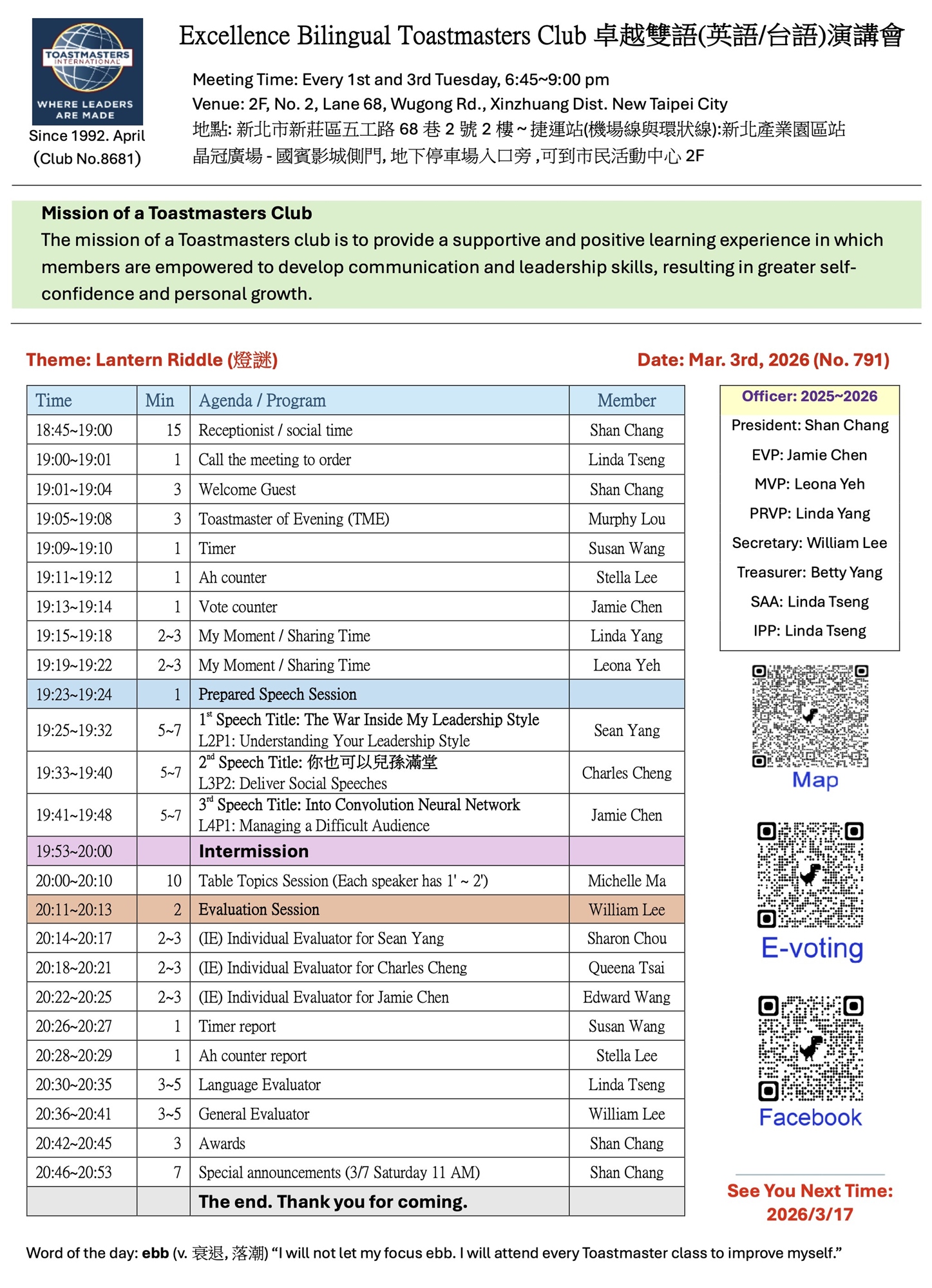 🌟 3/3 的 Excellence 英台語例會,主題是 lantern riddle,這真的很有創意。用英文講謎語,但答案卻是「國字」,再加上一張圖,等於是把傳統燈謎和跨語言的趣味結合起來,既挑戰腦力又增添文化味道。