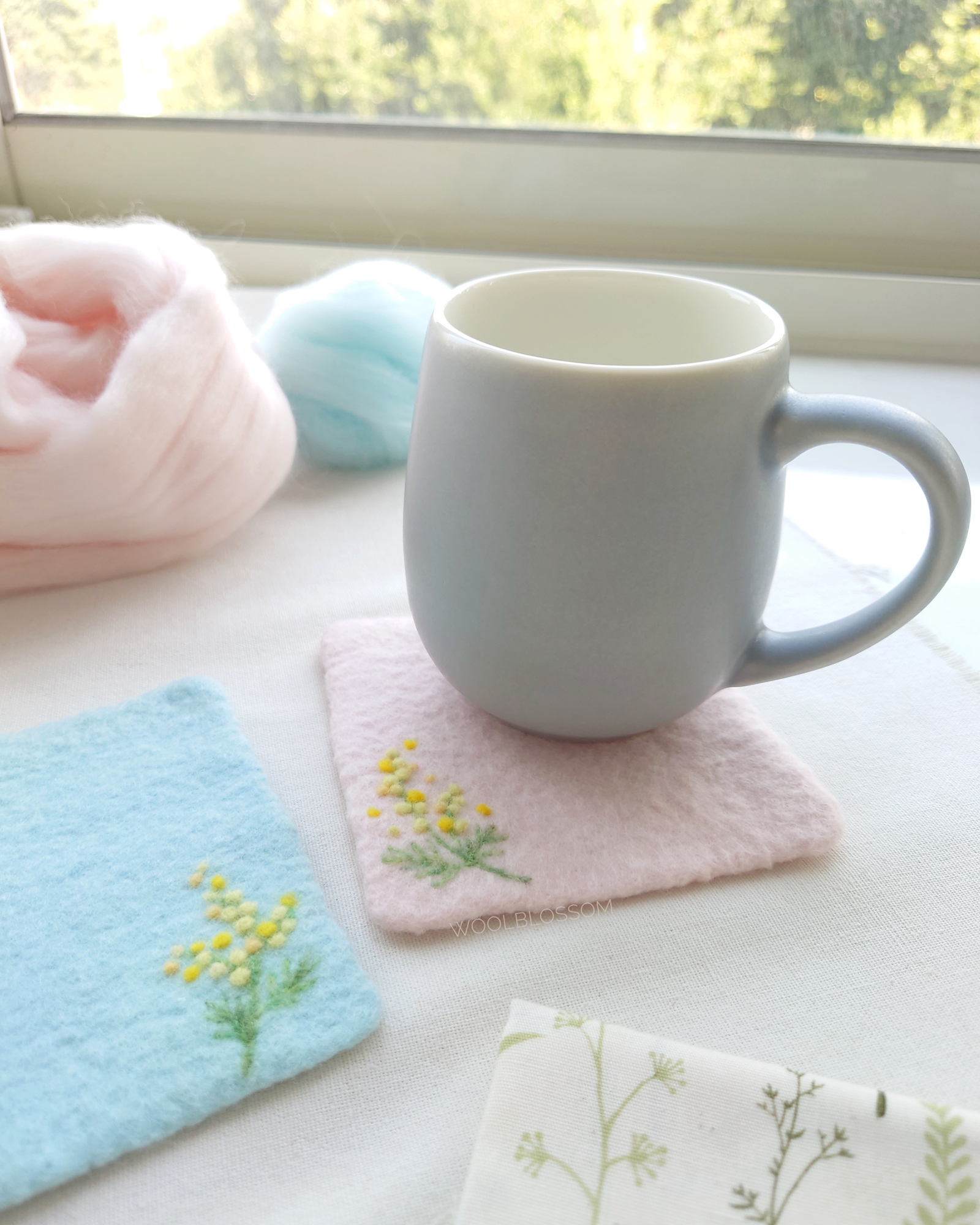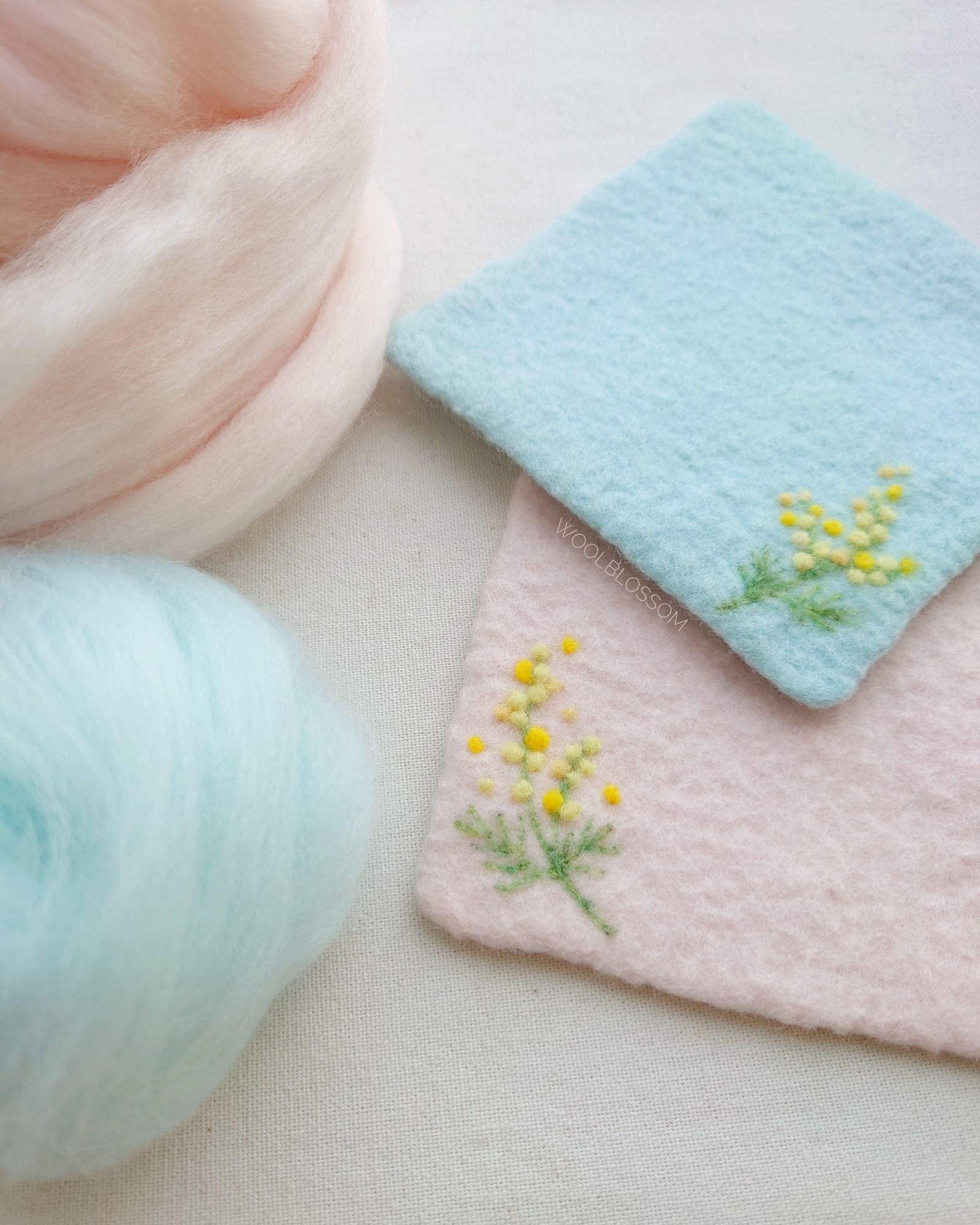 🌼 認識羊毛氈知識,會先以濕氈技法做出杯墊,再用針氈方式戳上金合歡,可同時學習羊毛氈兩大技法。