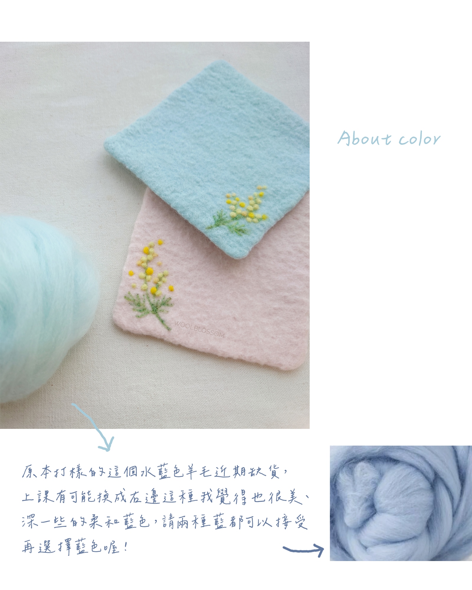 🌼報名時請由水藍色和淡粉色擇一,因水藍色羊毛近期缺貨,有可能換成另一個也很美、深一些的柔和藍色(見下方右側照片說明),請兩種藍都可以接受再選擇藍色喔!