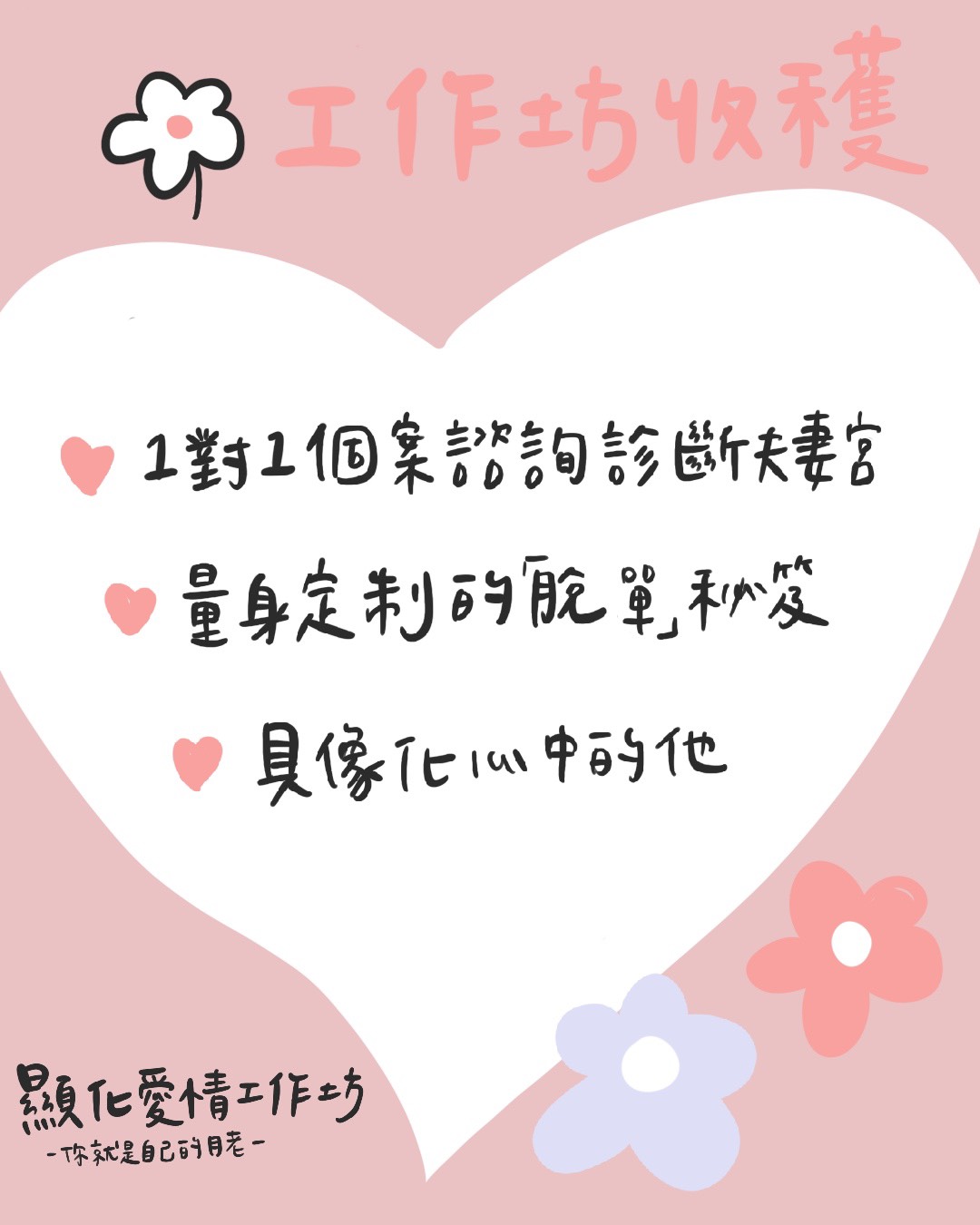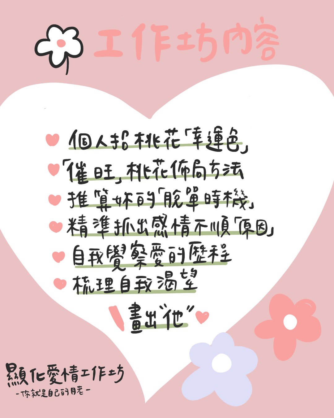 課程中將解析專屬招桃花幸運色、推算脫單時機,透過引導式繪畫描繪理想情人,