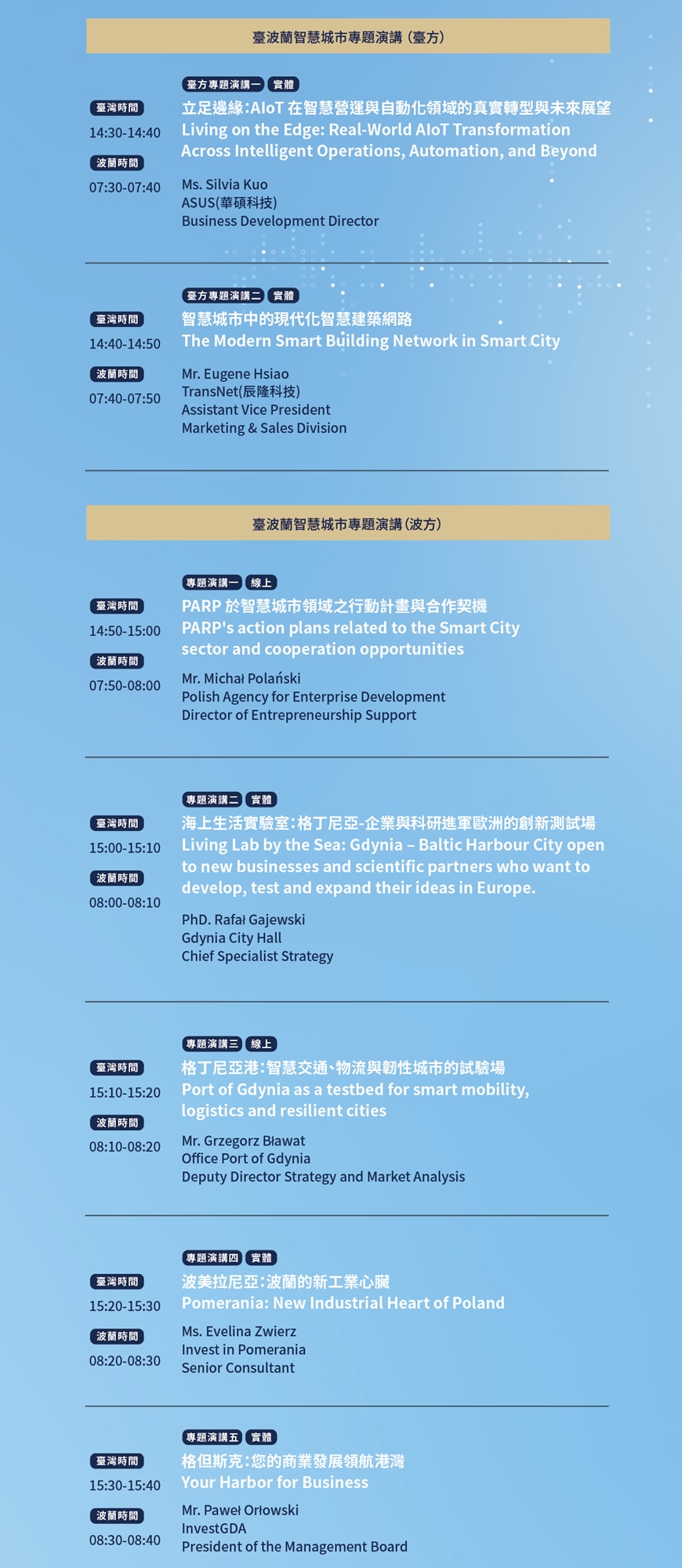Polish city leaders and industry experts will provide in-depth insights into the latest European smart city trends, ESG regulations, and net-zero transition policies, helping Taiwanese companies better understand concrete opportunities and policy directions across the Central and Eastern European market.