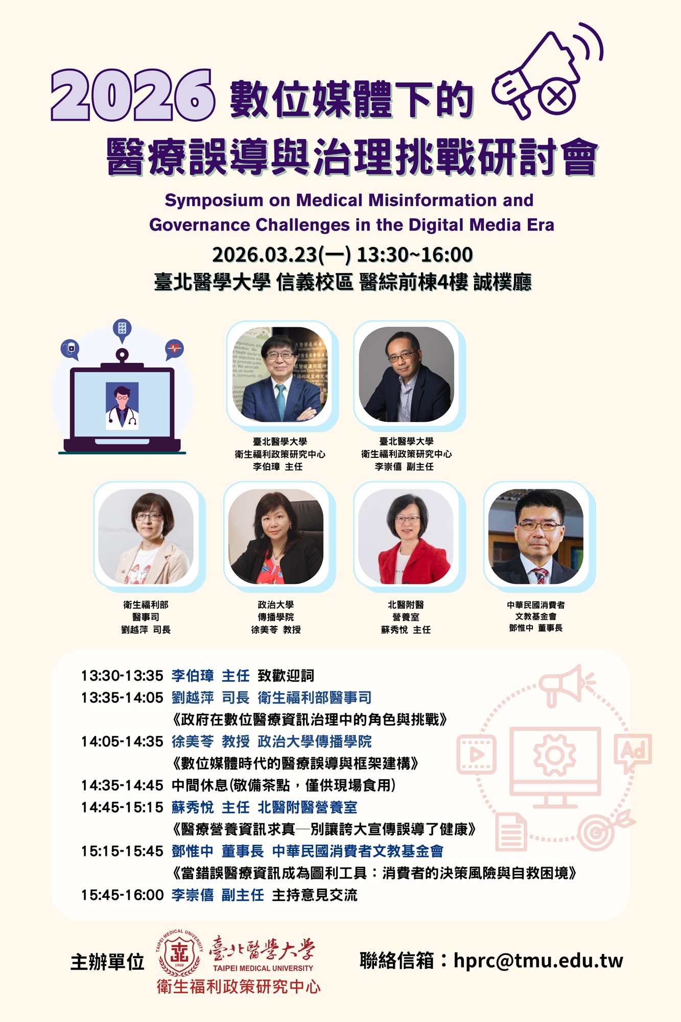 在此背景下,本次研討會以「數位媒體下的醫療誤導與治理挑戰」為主軸,聚焦錯誤醫療衛教資訊在數位媒體環境中的生成與擴散現象,並特別關注其在高齡化與長照情境下所衍生的治理課題。研討會將從制度設計、媒體責任、專業倫理及權益救濟等面向,系統性檢視醫療資訊治理所面臨的挑戰,並探討如何強化醫療資訊的可信度與提升民眾(尤其高齡族群與照顧者)之辨識能力。期盼透過公開且理性的對話,深化社會對數位醫療誤導問題的理解,為後續政策調整、長照場域健康溝通與公共風險管理奠定更具共識的討論基礎。