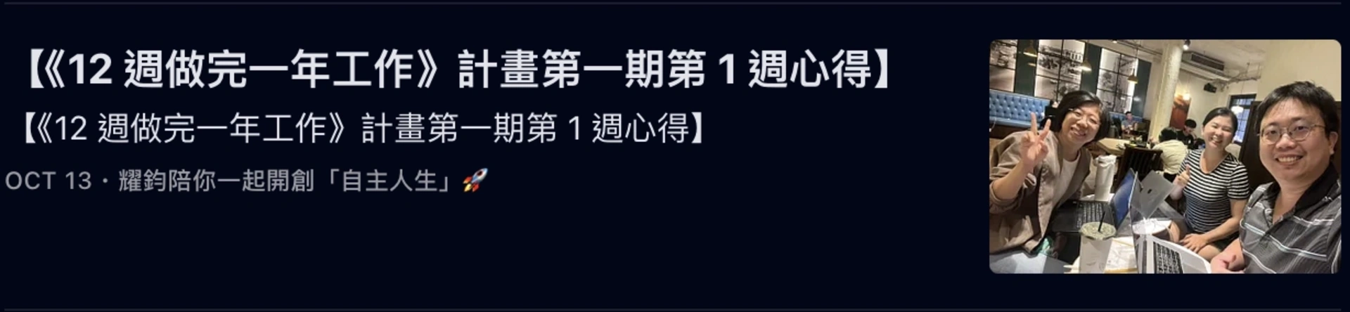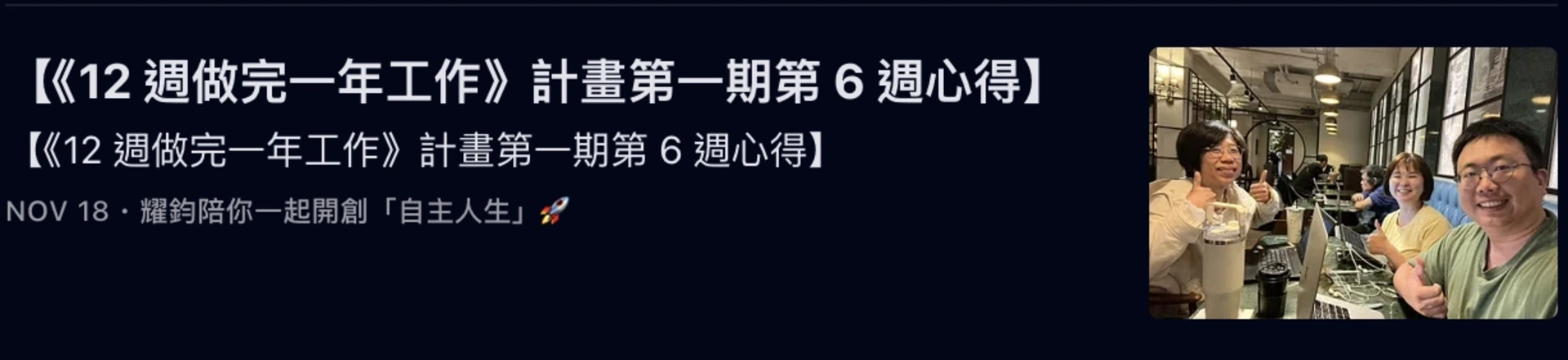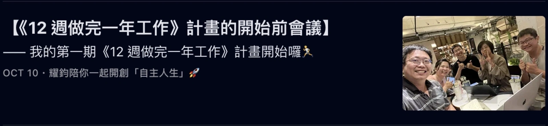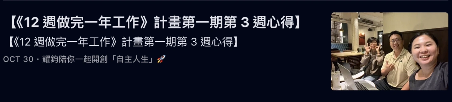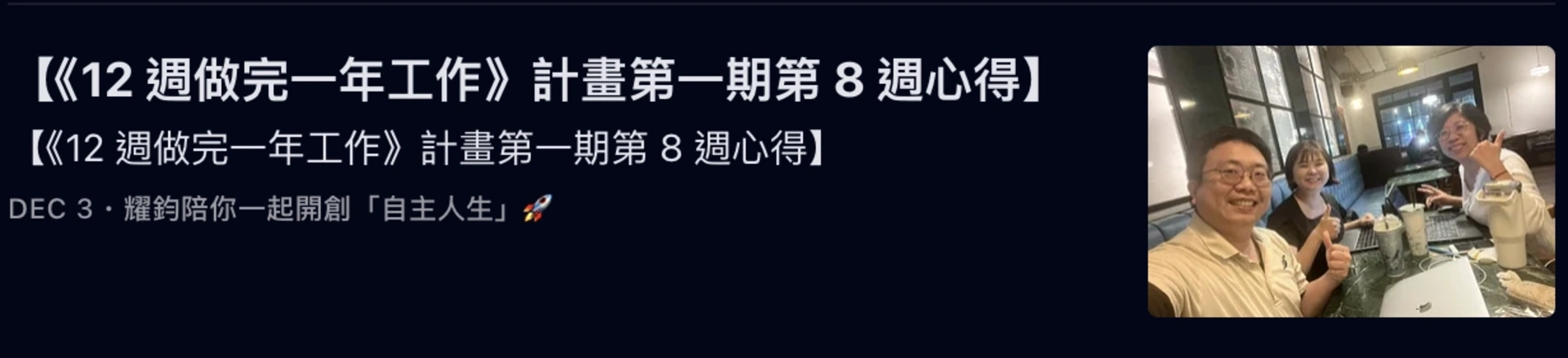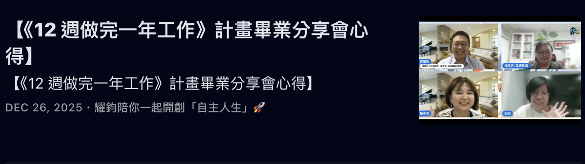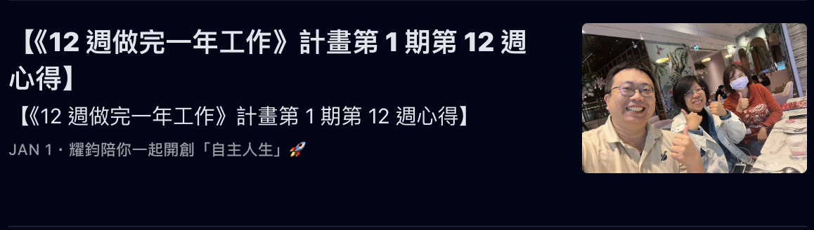 而我,更是帶著「執行型社群」的夥伴,執行了《12 週做完一年工作》計畫,並帶領他們完成了多週的「誇誇小聚」: