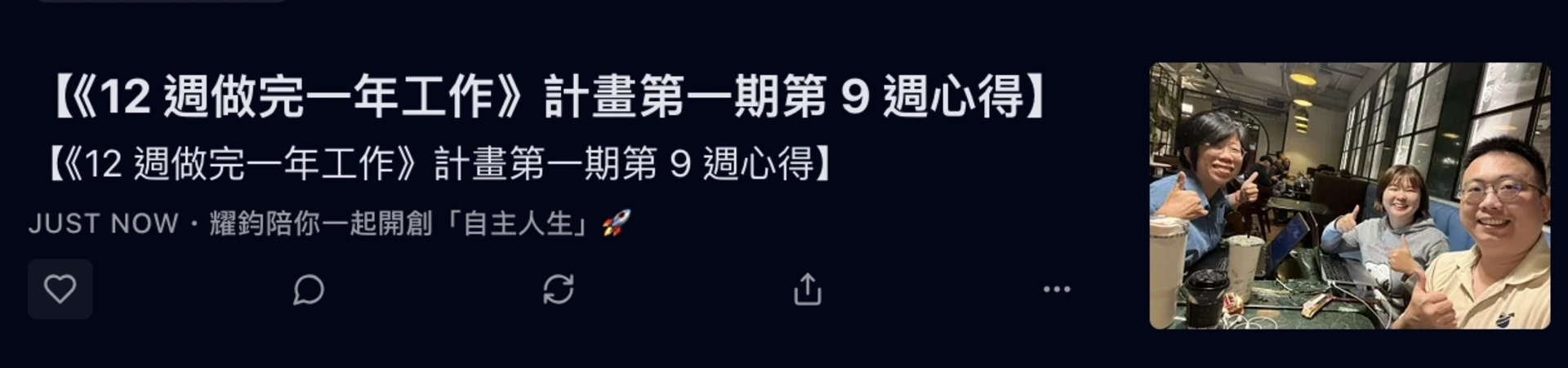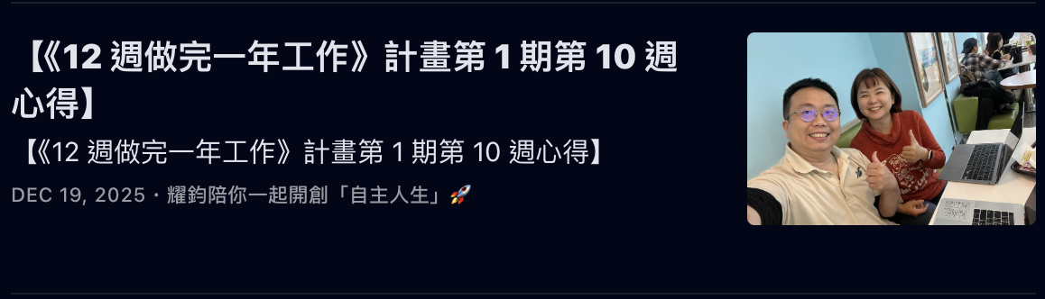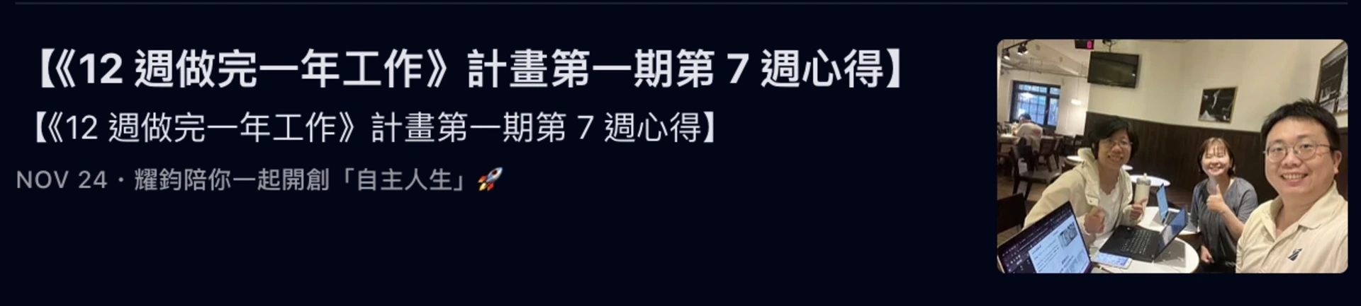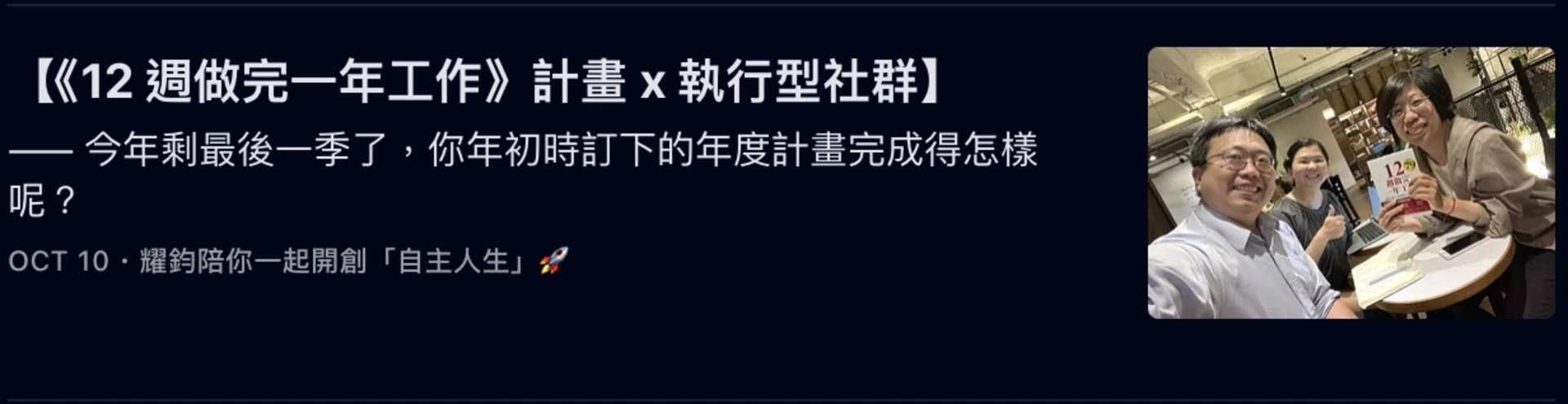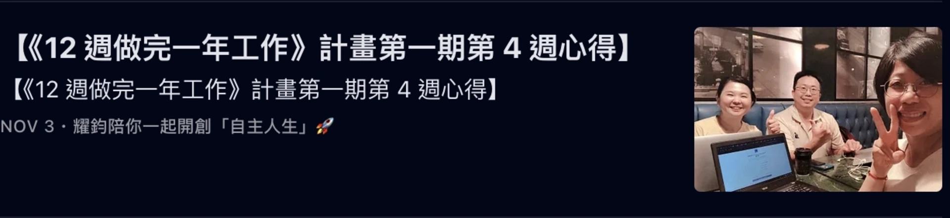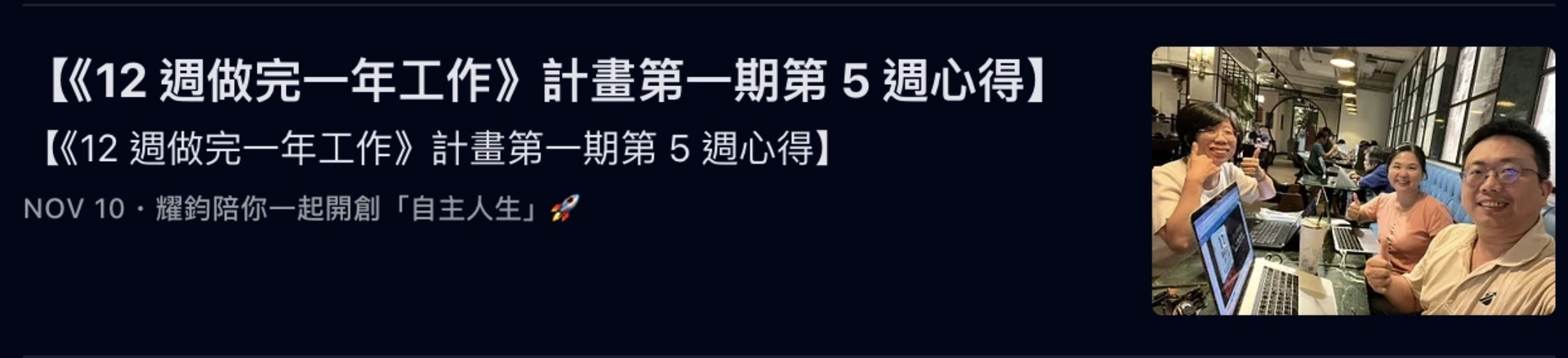 而我,更是帶著「執行型社群」的夥伴,執行了《12 週做完一年工作》計畫,並帶領他們完成了多週的「誇誇小聚」: