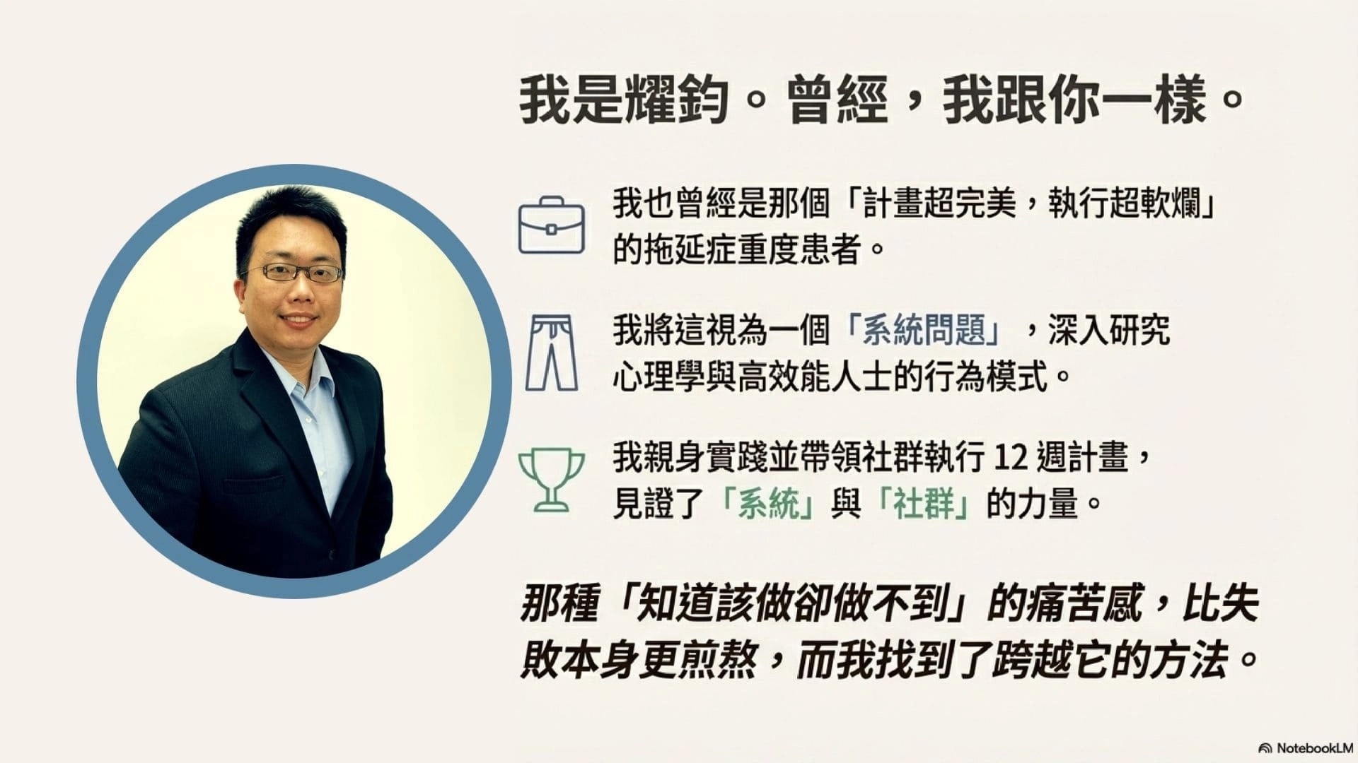 我深入研究了心理學、高效能人士的行為模式,以及時間管理的頂尖書籍,並將這些知識親身實踐在我的個人成長上,也試著帶領有相同困擾的人組建社群。