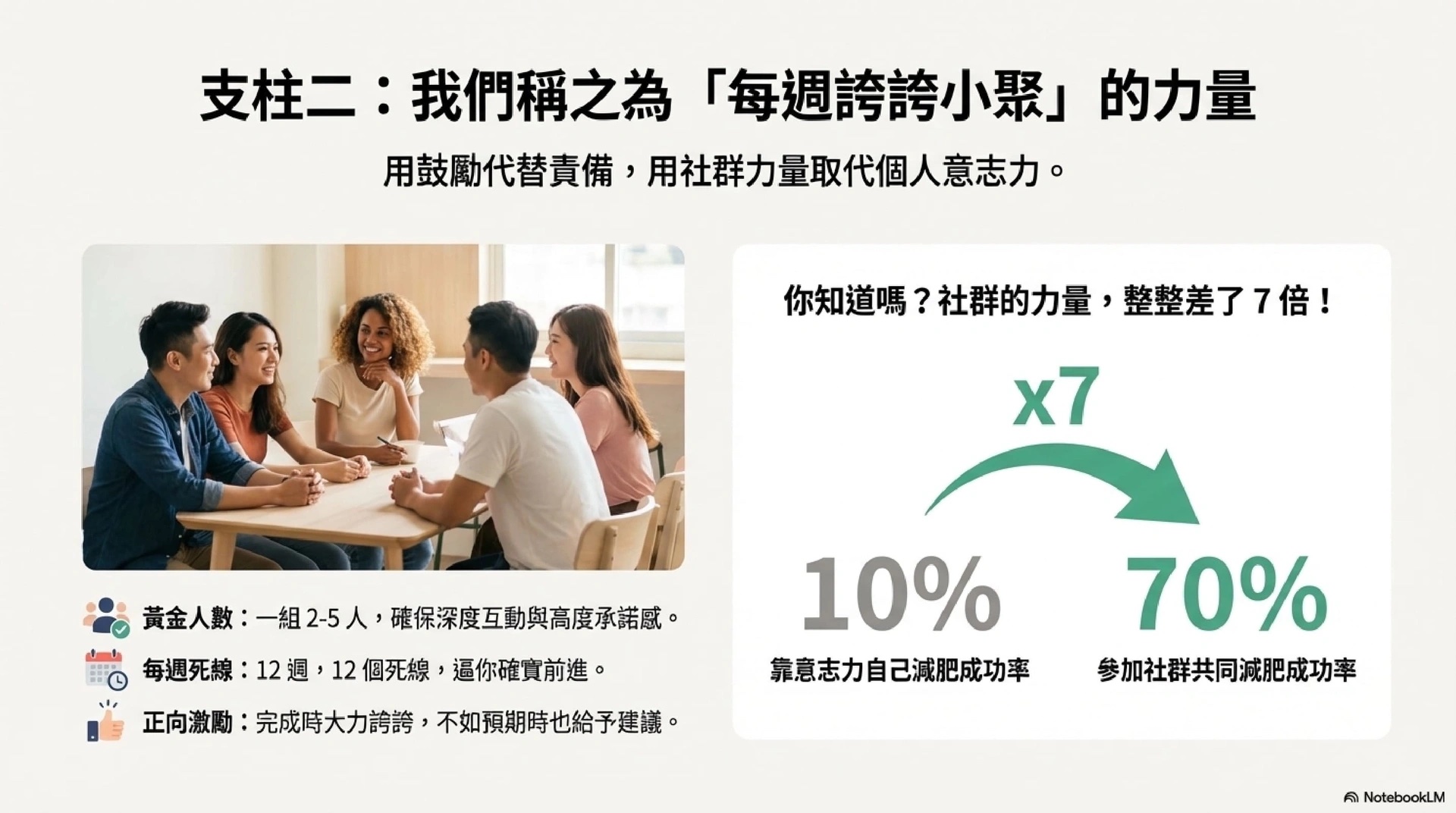 在 2~5 人的社群中,每個人的進度都「無所遁形」,更容易當責。