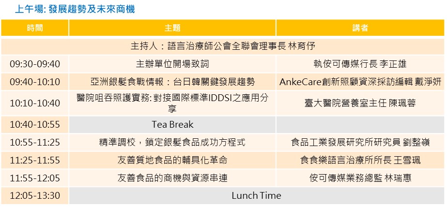 協辦單位 │ 中華民國牙體技術師公會全國聯合會、中華民國語言治療師公會全聯會、中華民國營養師公會全國聯合會、台北市社區銀髮族長期照顧發展協會、台灣口腔照護協會理事暨教育推廣訓練委員會、台灣生技產業聯盟、台灣咀嚼吞嚥障礙醫學學會、台灣居家服務策略聯盟、台灣長期照顧發展協會全聯會、台灣長照社團法人協會、台灣保健營養食品工業同業公會、台灣銀髮產業協會、永信社會福利基金會、食品工業發展研究所、桃園市長期照護體系協會、新北市長期照護發展協會、新北市糕餅商業同業公會、臺灣護理之家協會、質地友善食品產業聯盟 (TAF)
