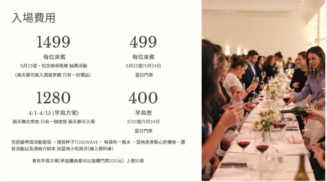 5/23 11:45-21:30 酒類市集到 1700最後點入場 晚宴 1830-2130
