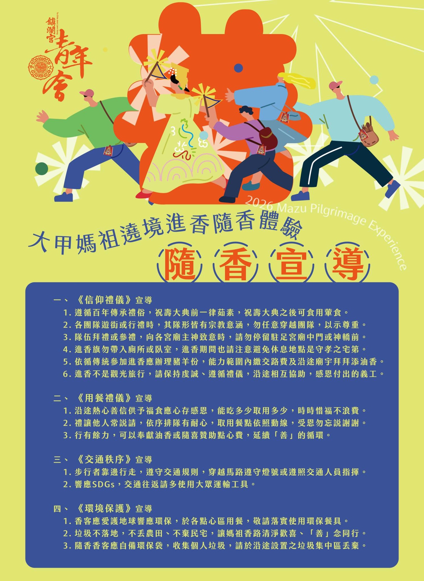 大甲鎮瀾宮天上聖母遶境進香,不僅名列國家重要民俗,更被Discovery Channel 譽為「世界三大宗教活動」之一。九天八夜徒步跋涉,接力造訪一百八十餘間宮廟,為讓更多人親身感受信仰凝聚的人情味與文化力量,特舉辦「隨香體驗」,邀請信眾走入百年香路,感受媽祖的慈悲與信仰的力量。 響應今年度大甲媽遶境進香主題「善」及 SDGs 永續發展目標,邀請隨香香客於行走之間具體實踐善念,並自備環保餐具,以友善環境的方式隨香同行,讓善念從人與人之間延伸到對土地的守護。2026讓我們一起與大甲媽善念隨行。