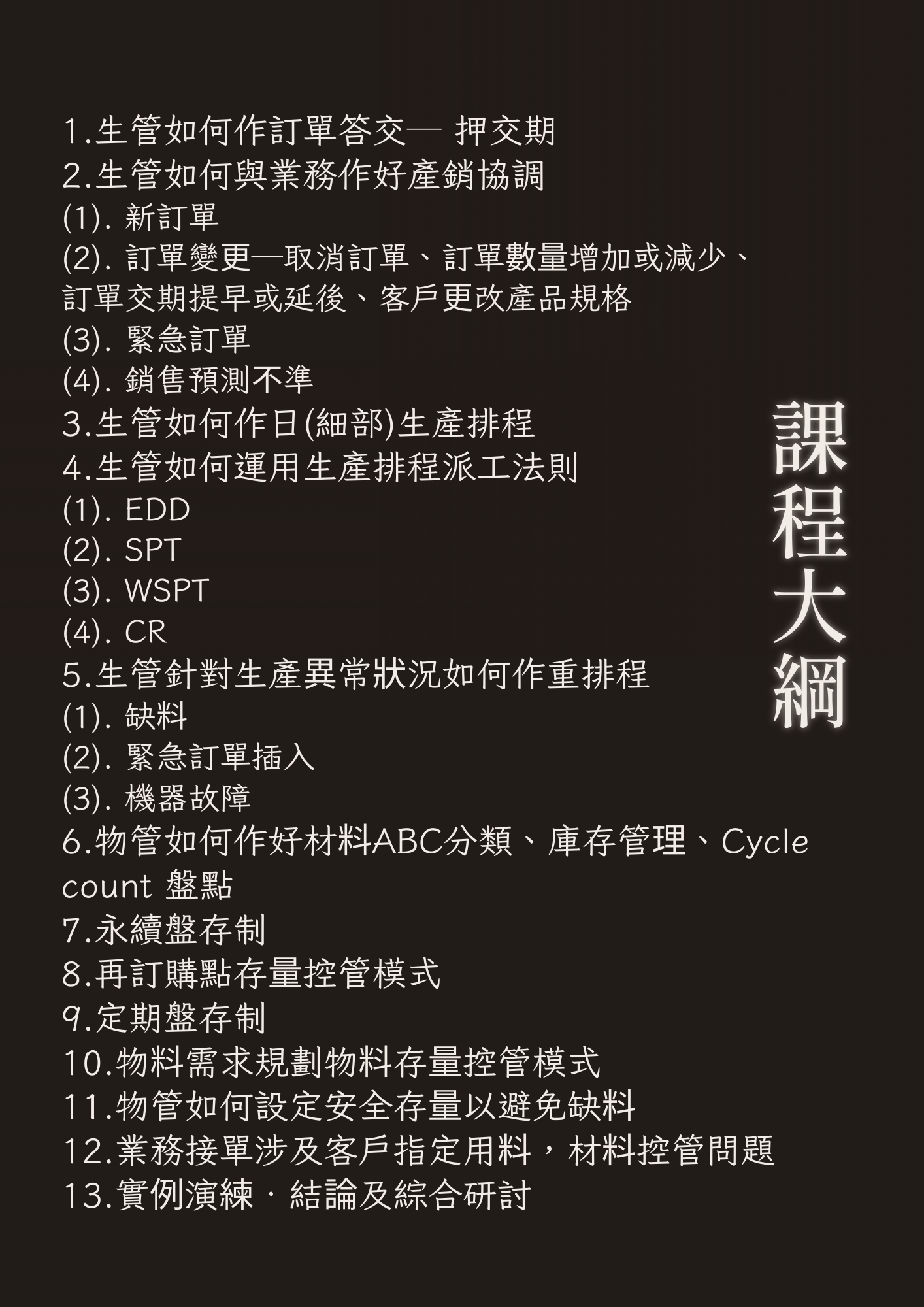 即學即用的實務技巧:提供多種實用的派工法則(EDD, SPT...)與控料模型,確保學習內容回廠即可落地應用。