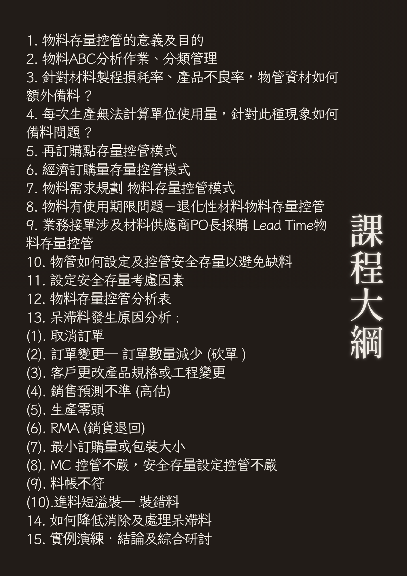3. 建立可落地的「處理與防範機制」:不僅教你如何防止產生新呆滯,更教你如何有效降低與消除現有的呆滯庫存,釋放寶貴的倉儲空間與資金。