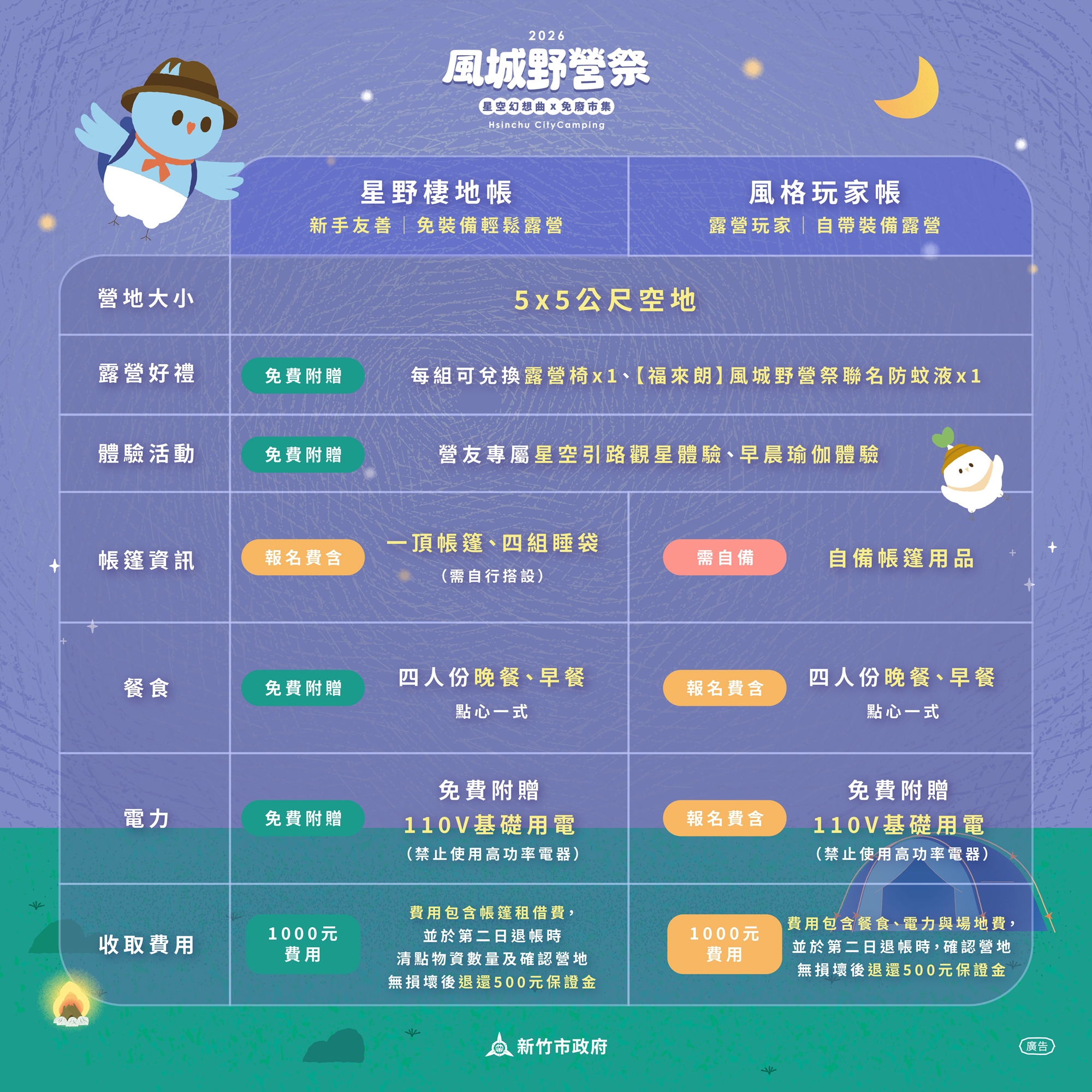 - 須自備帳篷、睡袋、照明等其他露營用裝備
