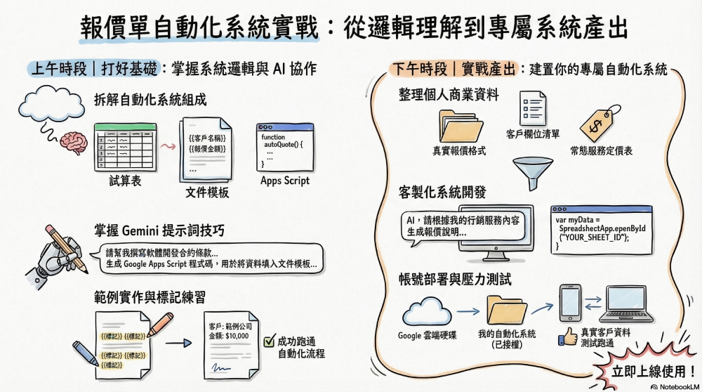 - 用老師準備好的範例資料,學會完整的自動化報價單流程