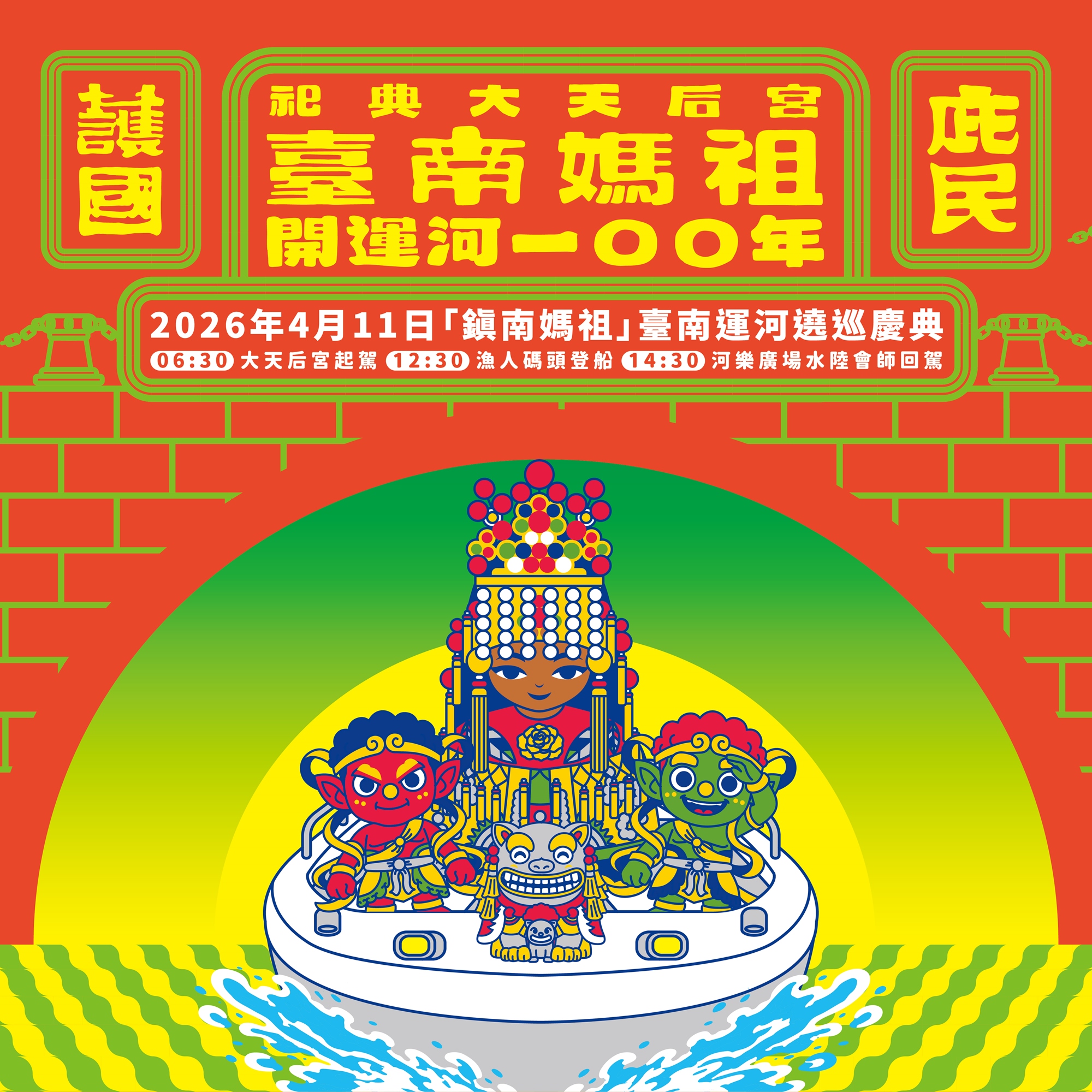 14:00 | 河樂廣場水陸大會師 說明: 【最高潮】百年瞬間:河樂廣場世紀水陸大會師 陸上的神轎陣頭與水上的媽祖聖駕,終於在河樂廣場震撼交會! 100年前的開通盛況,將在這一刻完美復刻。邀請您與千名信眾一同見證,萬人空巷、鼓樂喧天的磅礴場景,感受媽祖與開山聖王共同庇佑府城的慈悲力量。 | 河樂廣場 |