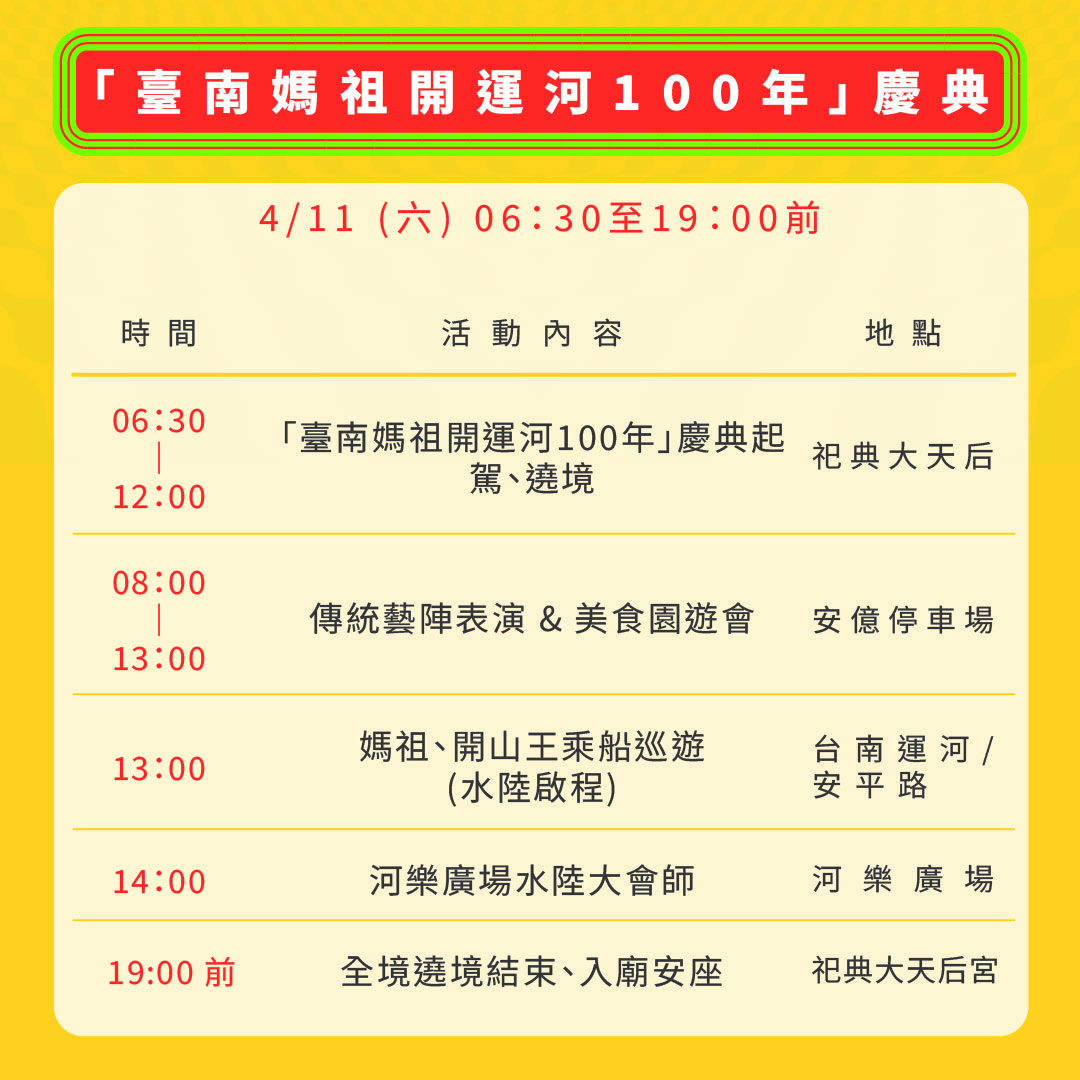 06:30-12:00 | 「臺南媽祖開運河100年」慶典起駕、遶境 說明: