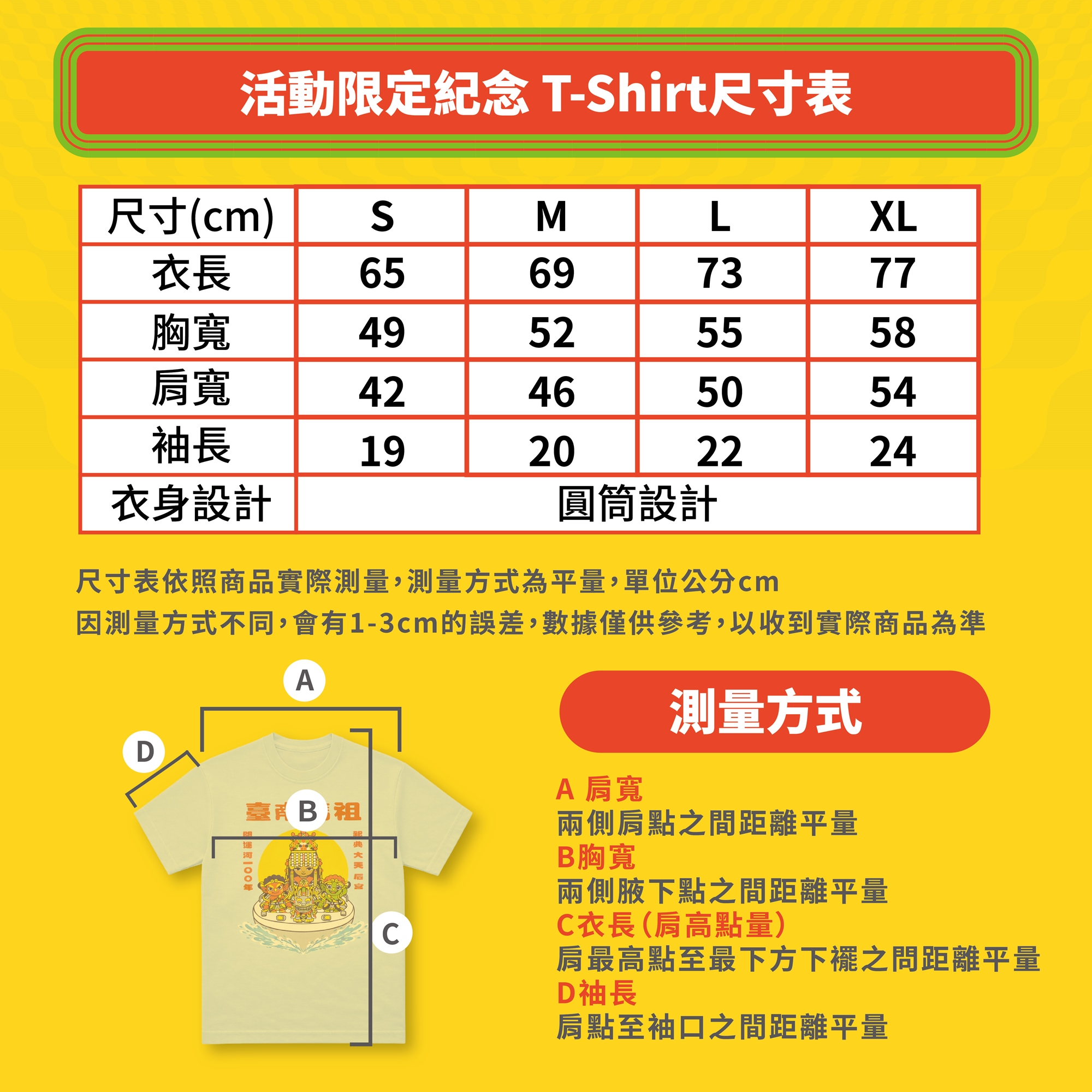 - 本活動紀念衫為本活動專屬訂製商品,報名時請務必正確填寫T-Shirt尺寸(S、M、L、XL)。因依實際加購數量製作,各尺寸數量有限,恕不保證提供更換服務,僅於庫存充足時協助調整。
