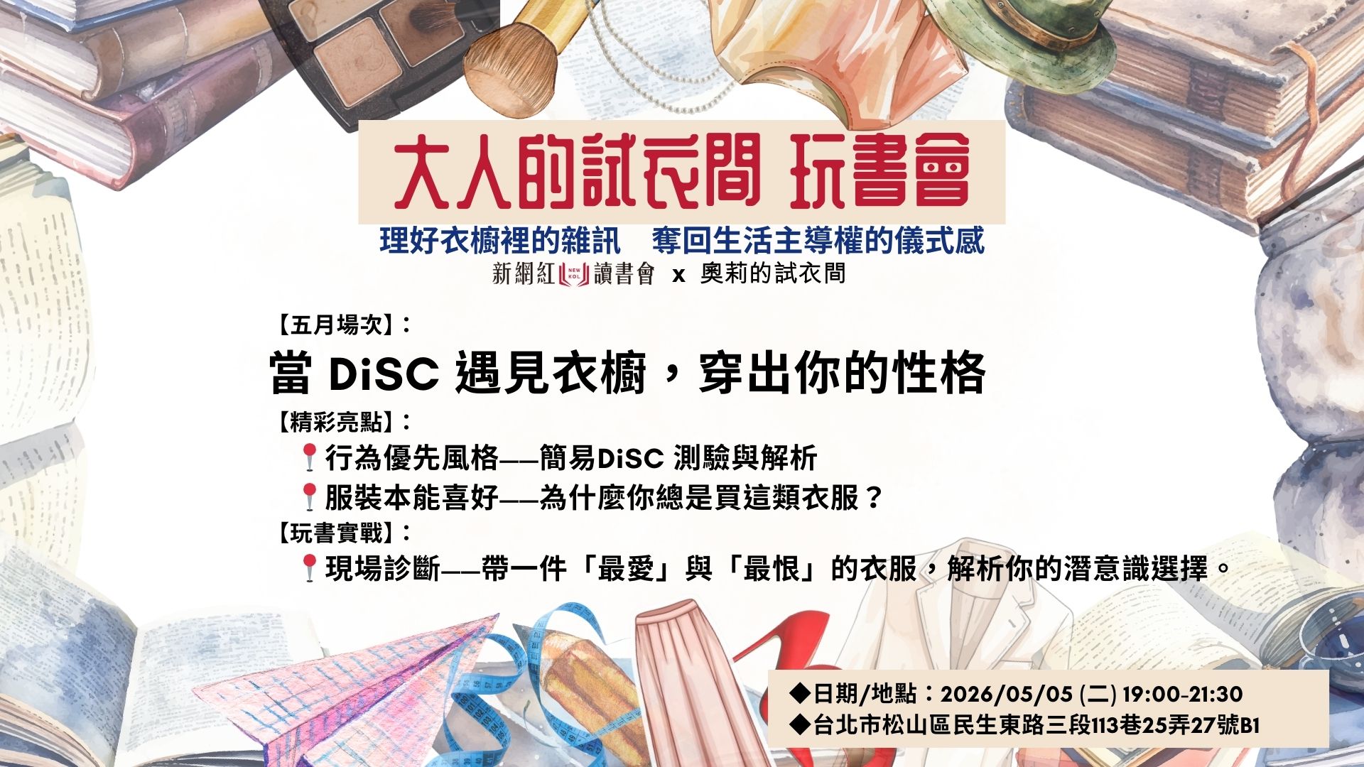 為什麼那件漂亮的衣服你買了卻不敢穿?為什麼有些衣服穿上身,你卻覺得渾身不對勁? 答案藏在你的「行為風格」裡!衣服是靈魂的居所,當外在穿搭與內在性格(DiSC)衝突時,尷尬或彆扭感就產生了。 這一晚,是一場心理學與時尚的碰撞。帶著你「最喜歡」與「最不喜歡」的衣服來現場,讓我們透過DiSC 測評,解開你衣櫥裡的心理謎題,實現「人衣合一」的自在境界。