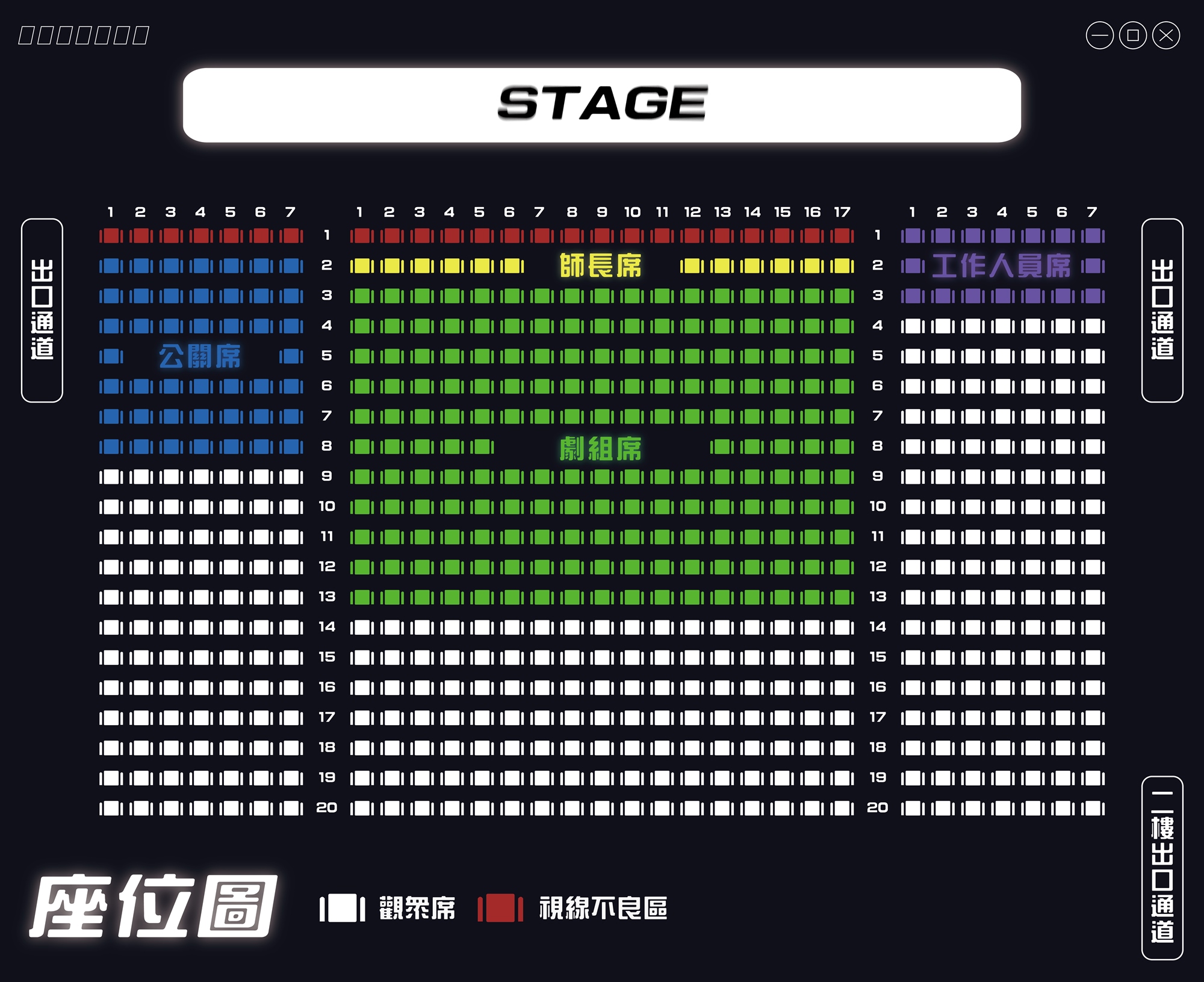 場內觀眾席皆可自由入座,其餘座位不對外開放。