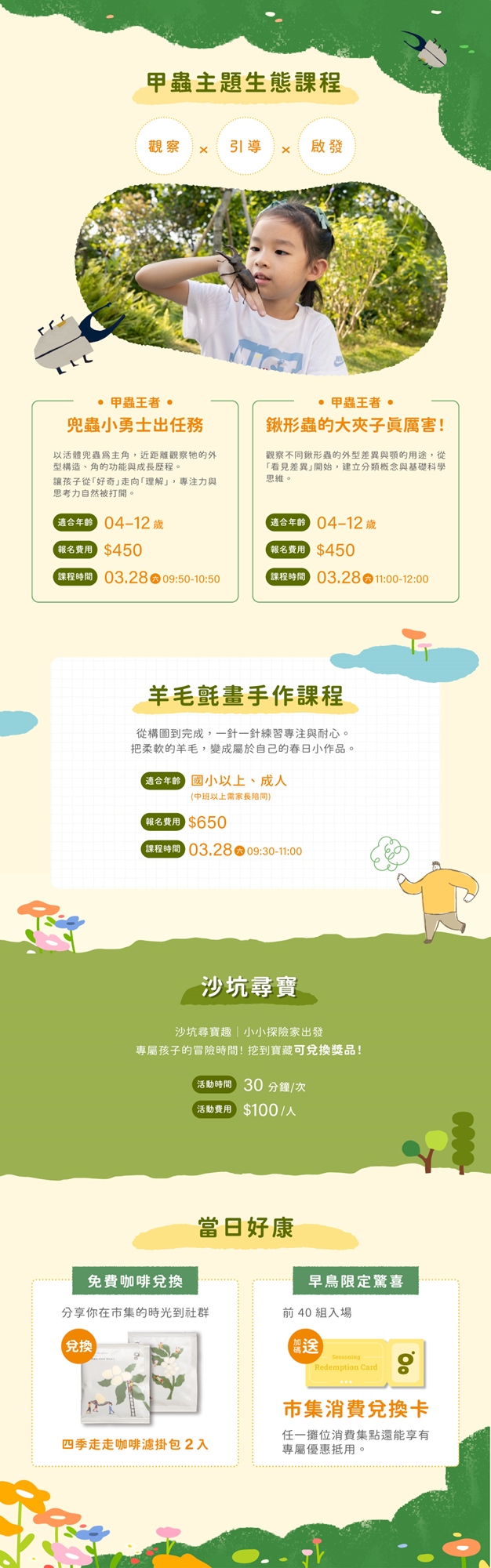 在遊戲與互動中,學習分享、表達與勇氣。除了小小攤主攤位,現場也準備了多種春日體驗,生態觀察、手作創作、沙地尋寶等活動,讓孩子在陽光、草地與自然裡探索世界。