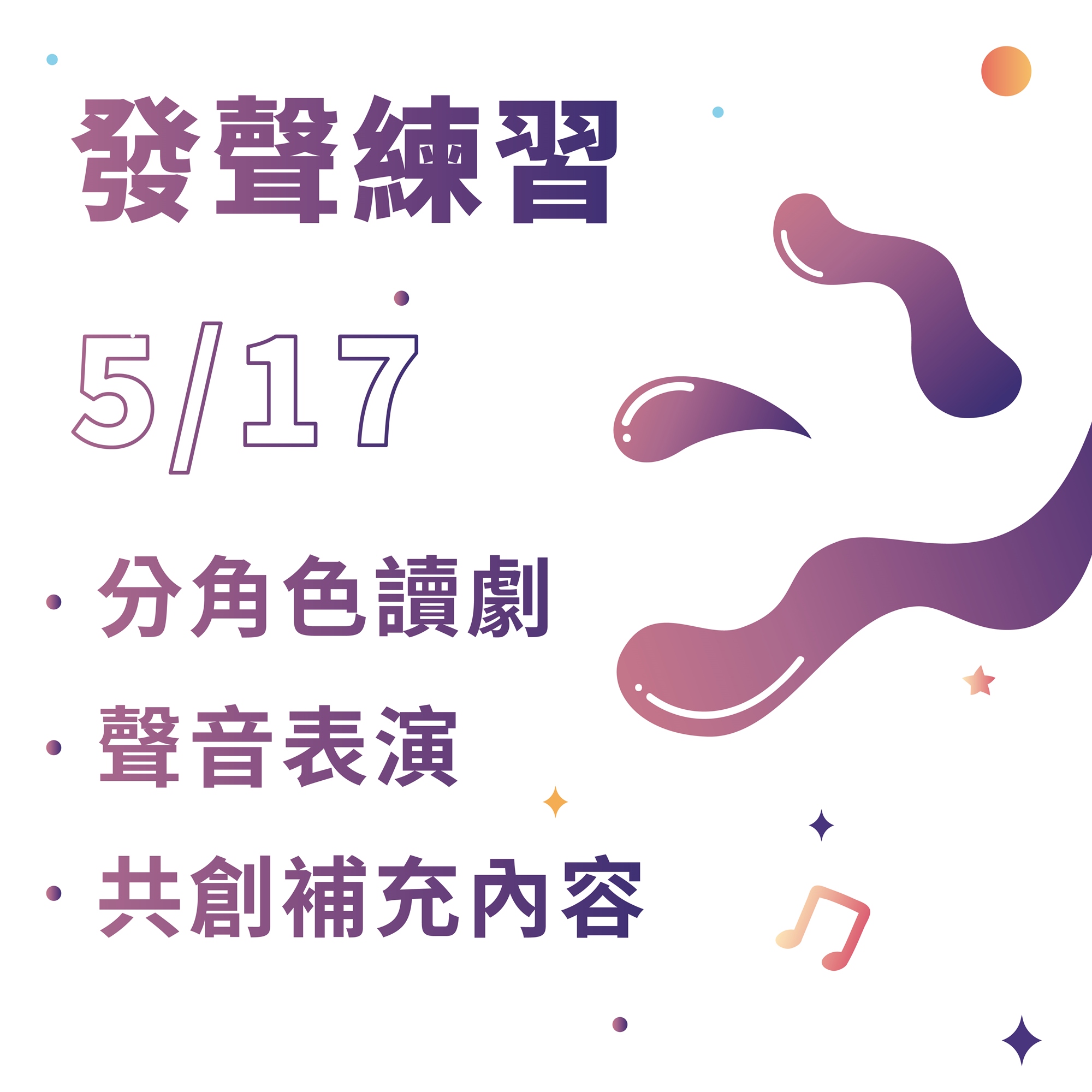 不需要表演或語言基礎,只要願意開口,就能一起體驗讀劇與聲音表達的樂趣。