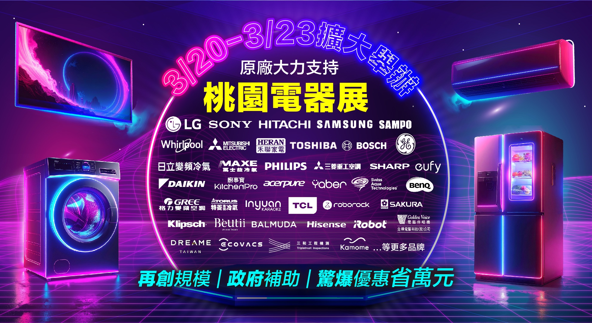 2026桃園唯一原廠支持大型電器展為回饋在地居民,特別請家電大廠加碼優惠,像是LG家電、SONY家電、日立家電、BOSCH家電、三星家電、惠而浦、禾聯家電、聲寶家電、日立冷氣、大金冷氣、夏普家電、萬士益冷氣、飛利浦、海信、九陽、TOSHIBA、音圓、金嗓伴唱機、三菱電機、格力變頻空調、TCL、三菱重工空調、特菱冷氣、GE奇異、廚事寶廚餘機淨水器、Klipsch音響、Beutii家電、科沃斯掃地機器人、eufy、BenQ、櫻花、瑞士水全戶淨水、BALMUDA家電、iRobot掃地機器人、Kamome家電、DREAME追覓掃地機器人、Yaber投影機...等,祭出「最強萬元折扣」獻給大家,趕緊把握3/20-3/23桃園會展中心(機捷A19站旁),不管新屋新購、汰舊換新、小家電贈禮絕對滿足大家需求省荷包!