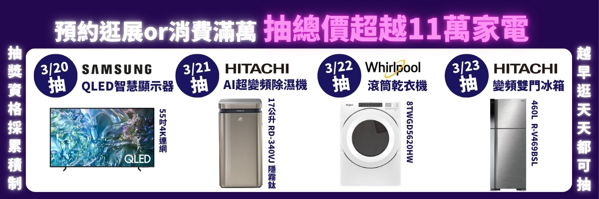 凡成功預約「桃園電器展預約逛展抽萬元家電」者,即可於展覽期間2026/3/20(五)~3/23(一)10:00~18:00至北台灣全新國際級展覽館『桃園會展中心(機場捷運A19站旁)大會服務台』,憑登錄成功後獲得之QR Code手機畫面,經工作人員設備確認無誤,即可參觀桃園電器展獲得萬元家電抽獎資格,進入展覽選購數百款家電皆享展覽獨家加碼驚爆優惠。