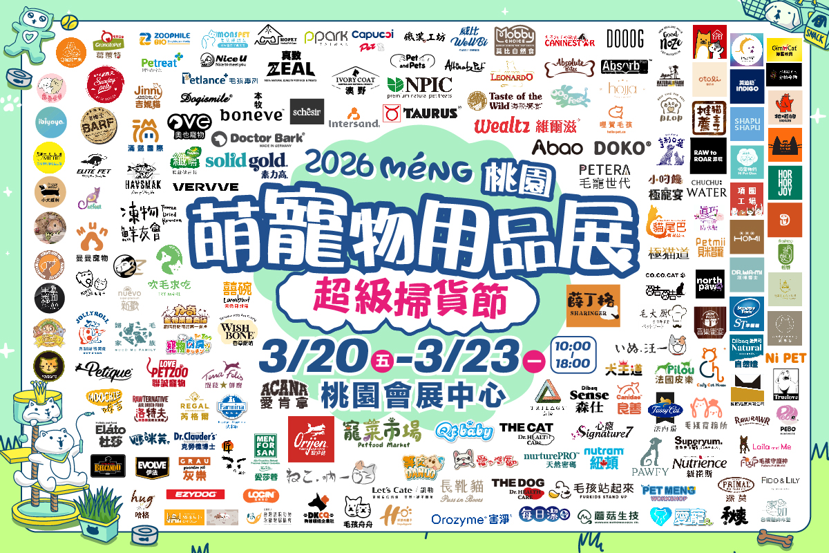 桃園萌寵物用品展屢創驚人佳績,萬名毛孩家長掃貨不停、人潮爆滿、熱鬧非凡!2026以「超級掃貨節」為主軸毛孩專屬狂歡場,百大人氣品牌齊聚、萬件好物現場帶走!從日常飼料到高端凍乾、從春夏服飾到爆款推車,還有寵物家電、保健美容用品、手作小物等閃耀登場!這一次,把毛孩所需一次買齊,最多優惠、最深折扣大滿貫!此外,客製寵物名牌與牽繩服務,打造毛孩穿搭風格;另外新品首發搶先體驗、品牌快閃活動輪番上陣,打出絕無僅有的重砲優惠!