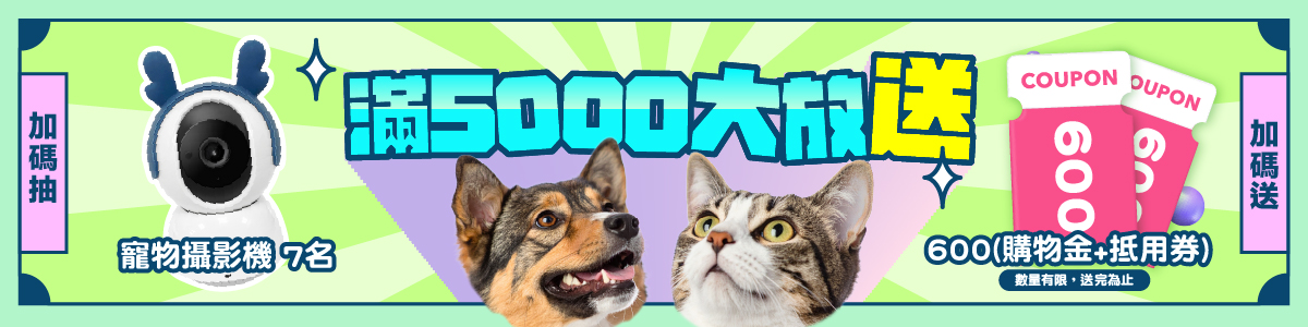 消費滿5,000直接送600回饋(300元購物金+300元抵用券),數量有限、送完為止!累積消費越多,中獎機率越大, 消費滿5,000元再送1張摸彩券,滿10,000元送2張、滿15,000元送3張,以此類推,買越多中獎機率越高!這次加碼抽出7台寵物攝影機,讓你補貨順便把科技好物一起搬回家!