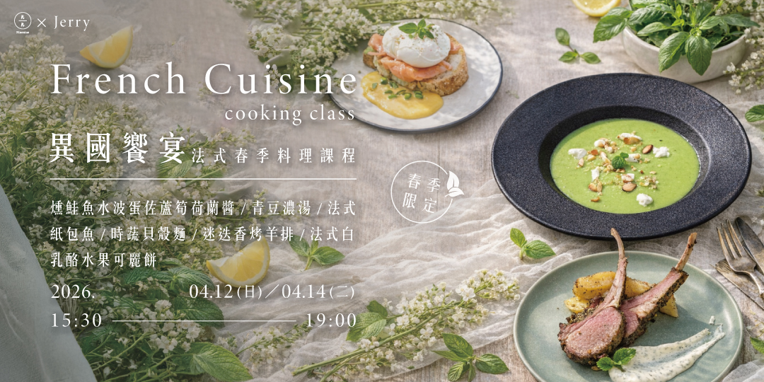 本課程以「法式春季餐桌」為主題,從當季蔬菜,到家常料理中的細膩工法,邀請你走進法國春天裡,充滿層次的餐桌風景。