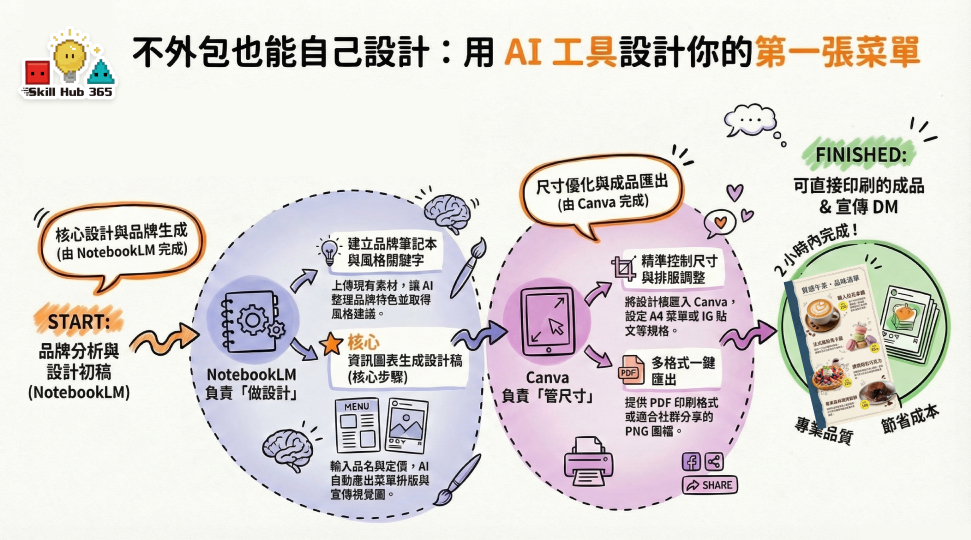 - 🔄 下次更快:NotebookLM 筆記本保留品牌知識,換季菜單只要更新品項,10 分鐘內完成
