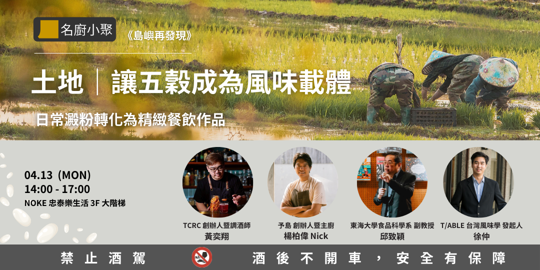 今年適逢蓬萊米在台百年,首場名廚小聚以「後壁稻米」為核心,串連台南特色五穀,力邀 TCRC 創辦人暨調酒師黃奕翔、予島餐廳創辦人暨主廚楊柏偉,展開實驗性創作,他們透過糖化技術解構澱粉,探索穀物在精緻餐飲語境中的嶄新可能,並將在講座中分享本次實驗心得以及餐飲研發的心法。同時,也將談談他們在餐飲途中的心路歷程,以及如何透過調飲和料理述說土地的故事。