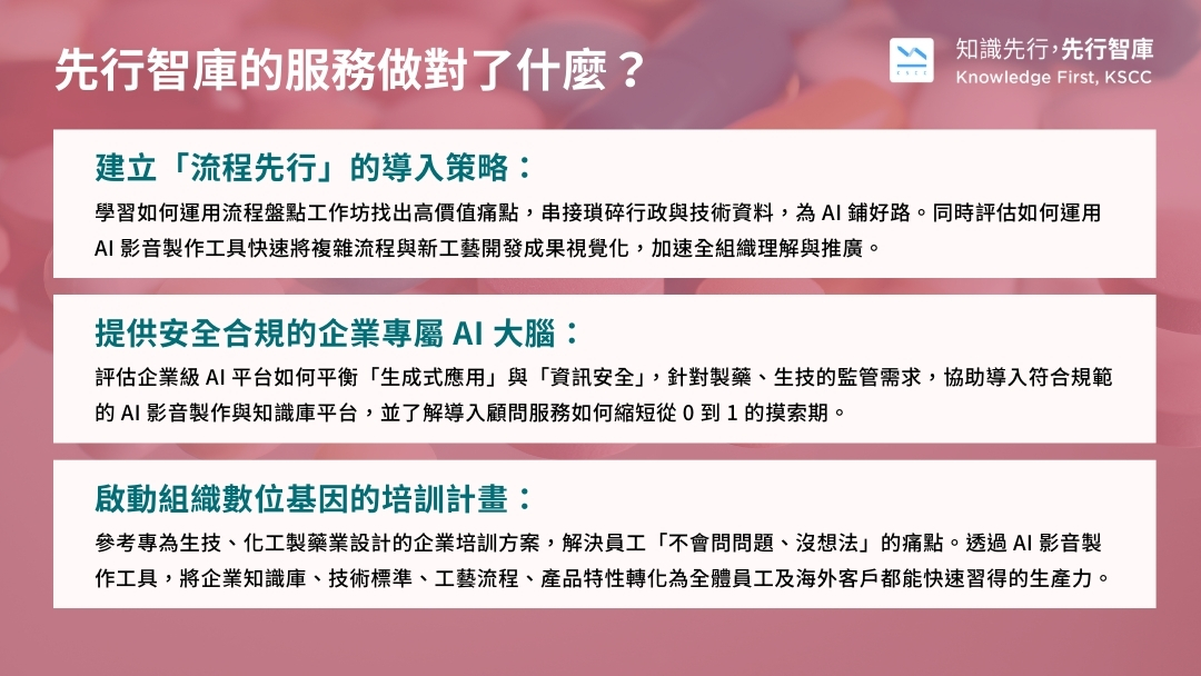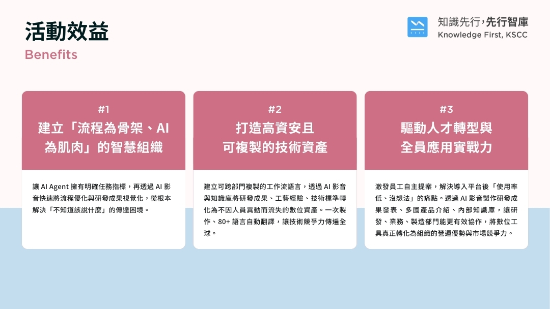 - 【落地難題】 使用率不高的真相:如何激發員工想法、克服資安限制、用影音知識庫加速知識流通,真正釋放人力回歸核心創新。