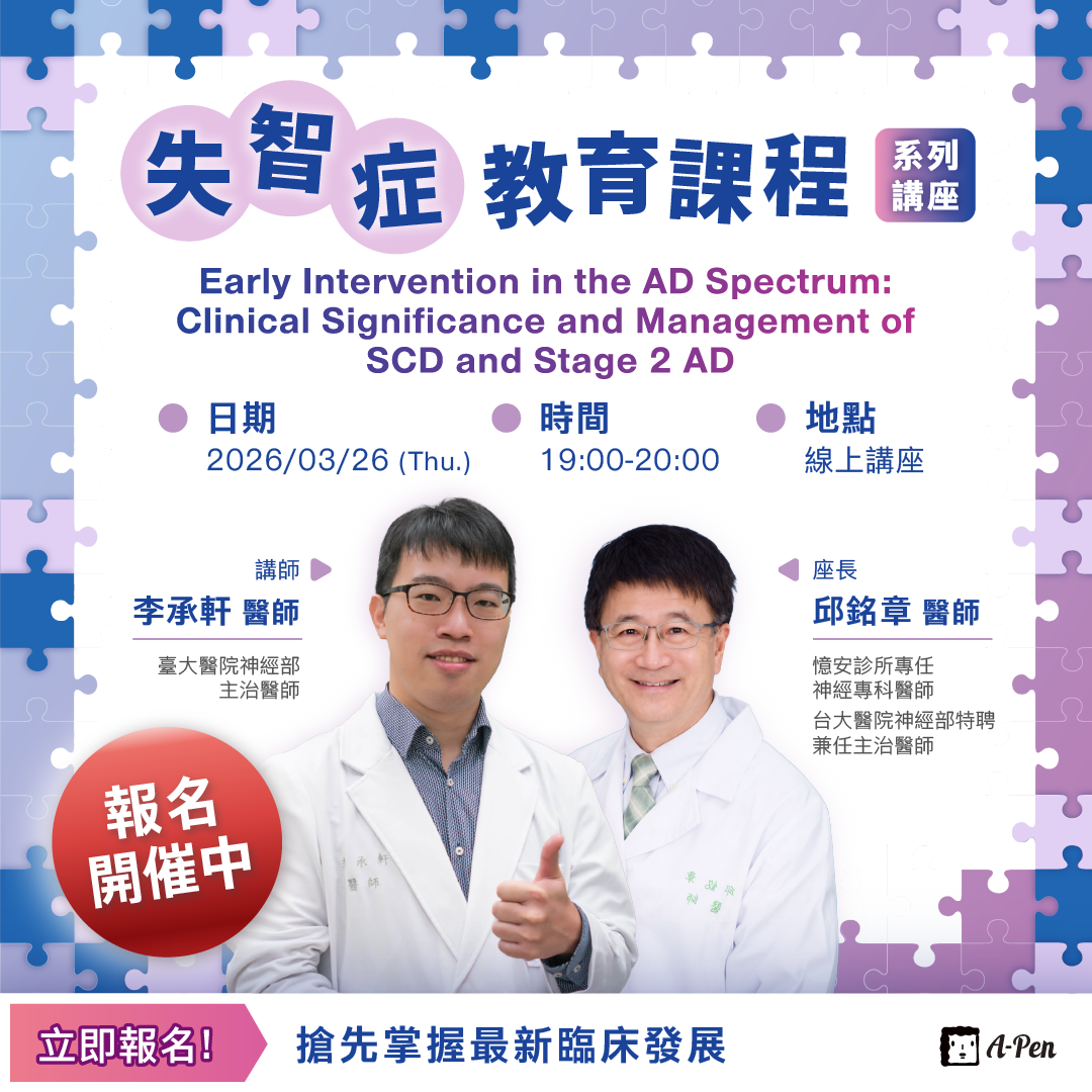 📢 線上講座《Early Intervention in the AD Spectrum: Clinical Significance and Management of SCD and Stage 2 AD》申請繼續教育學分❗