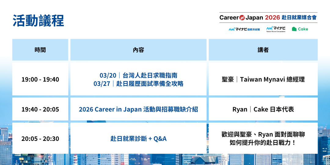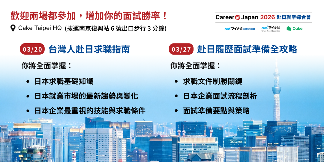 - 報名辦法:歡迎填寫 Cake 赴日就業診斷,領取 2026 Career in Japan 赴日就業媒合會 活動報名攻略!