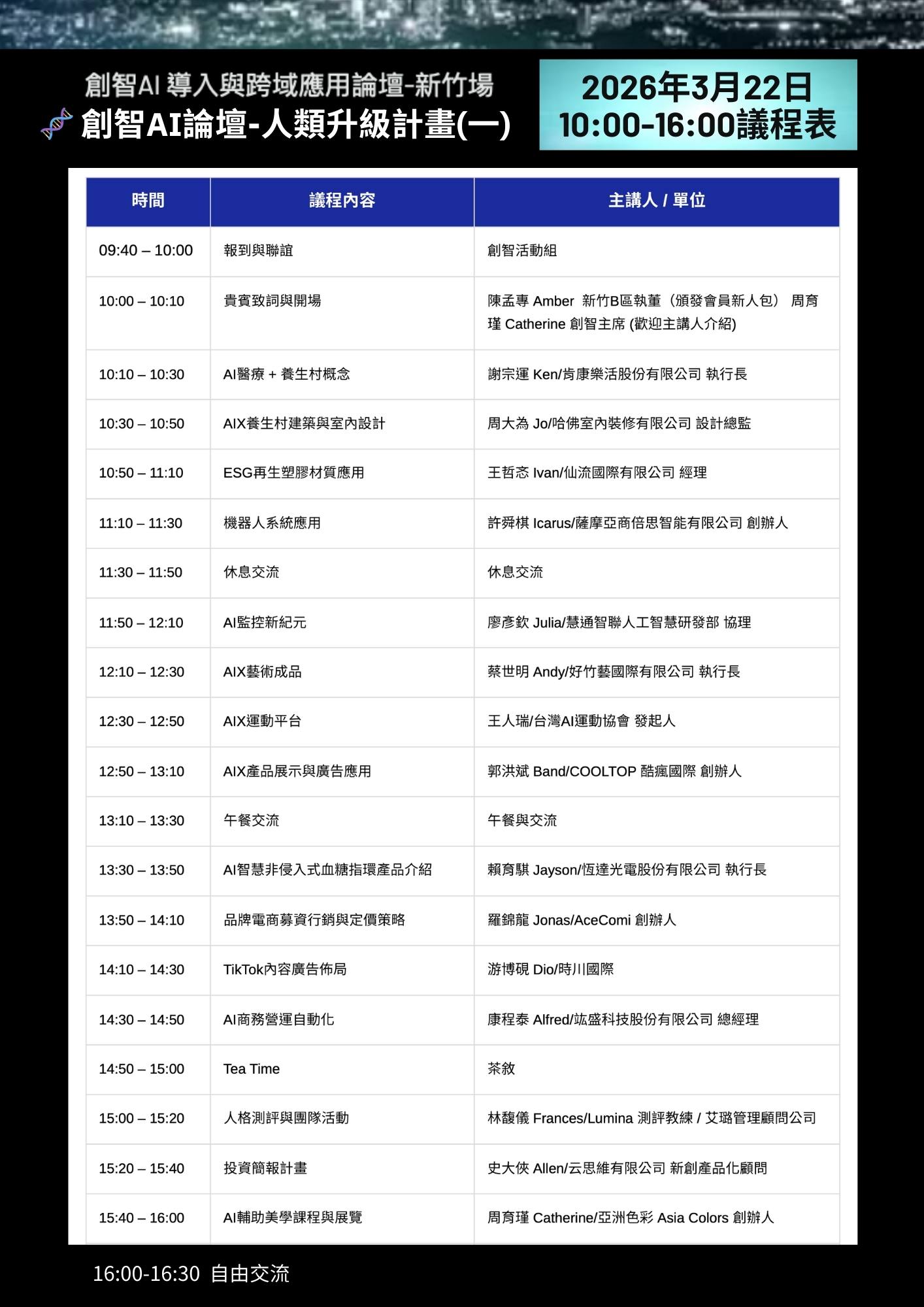 主辦單位:新竹B區、創智AI分會、亞洲色彩、酷瘋國際、肯康樂活、AceComi、艾璐管理顧問、竑盛科技、恆達光電、哈佛室內裝修、 好竹藝、 薩摩亞商倍思智能、仙流國際、慧通智聯、云思維、時川國際。