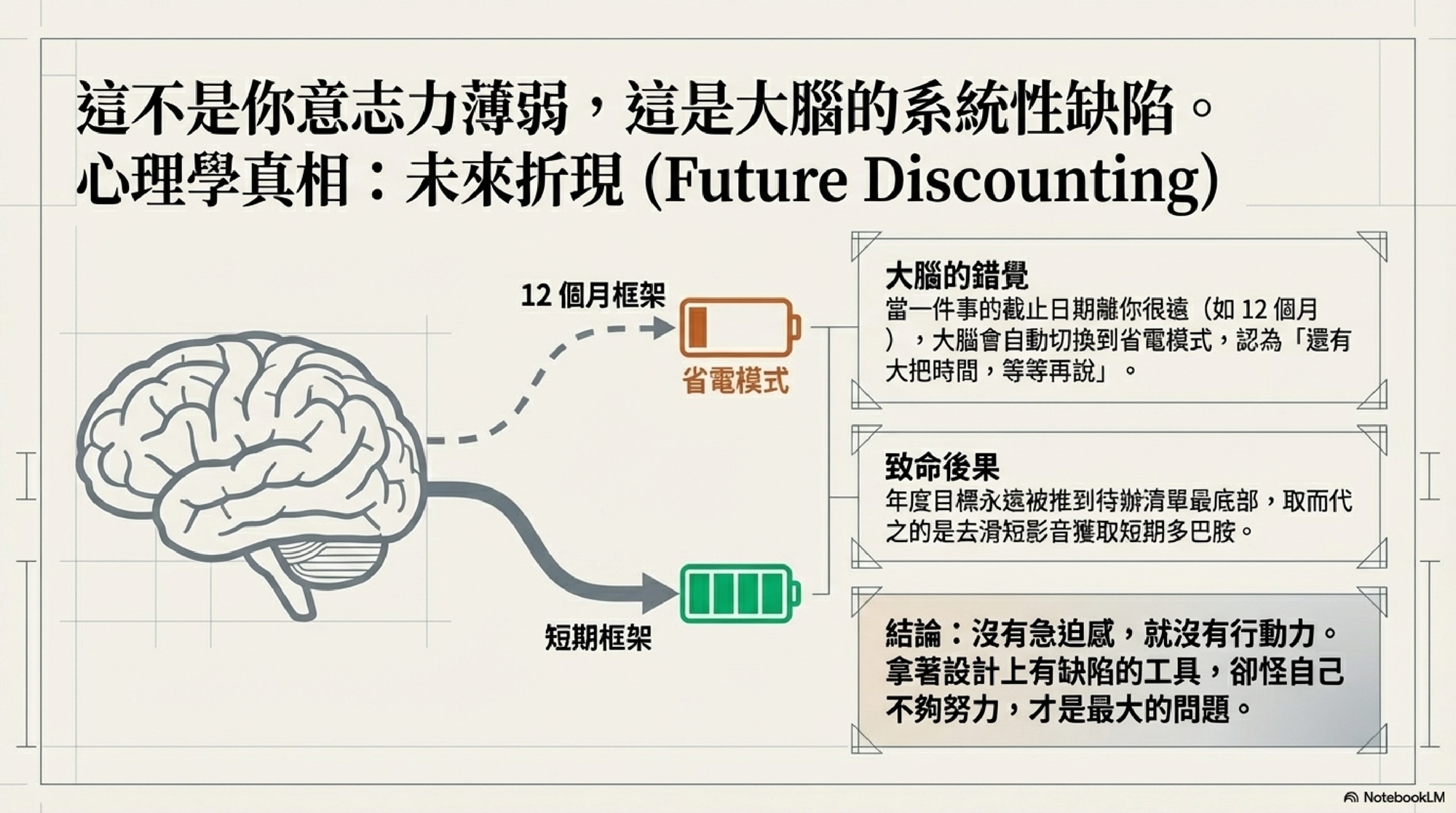 所以當你每次對自己說「今年要做到」時,你的大腦聽到的是:「喔,還有好多時間嘛。」