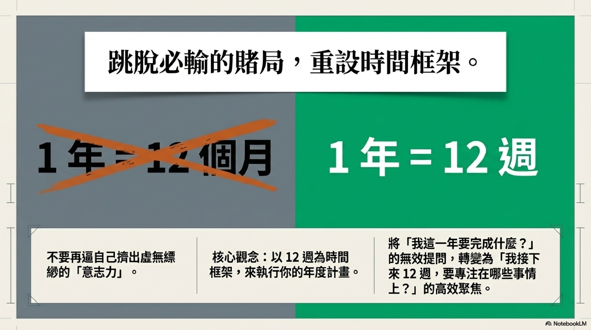 不要再問自己「我這一年要完成什麼」,而是改問:「我接下來 12 週,要專注在哪些事情上?」