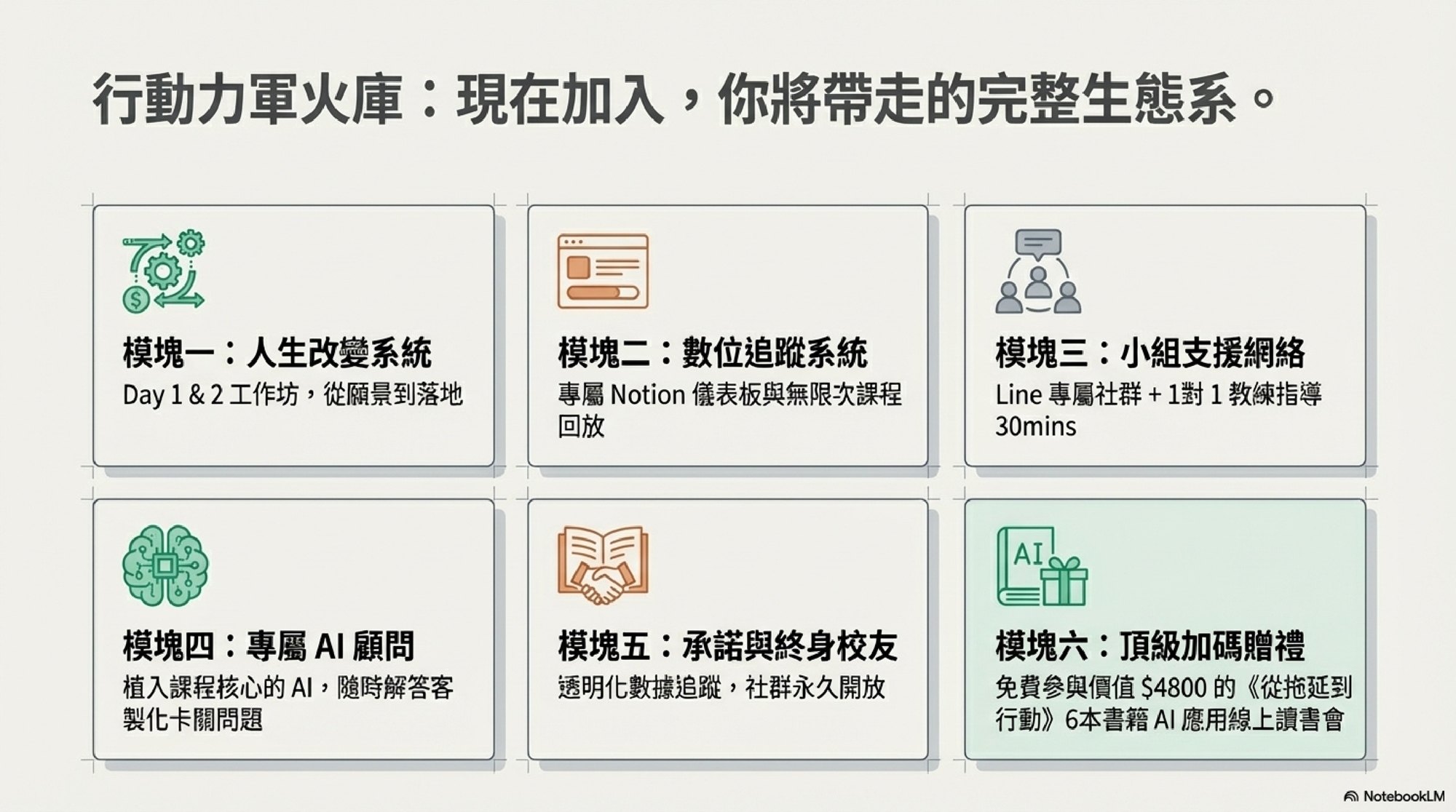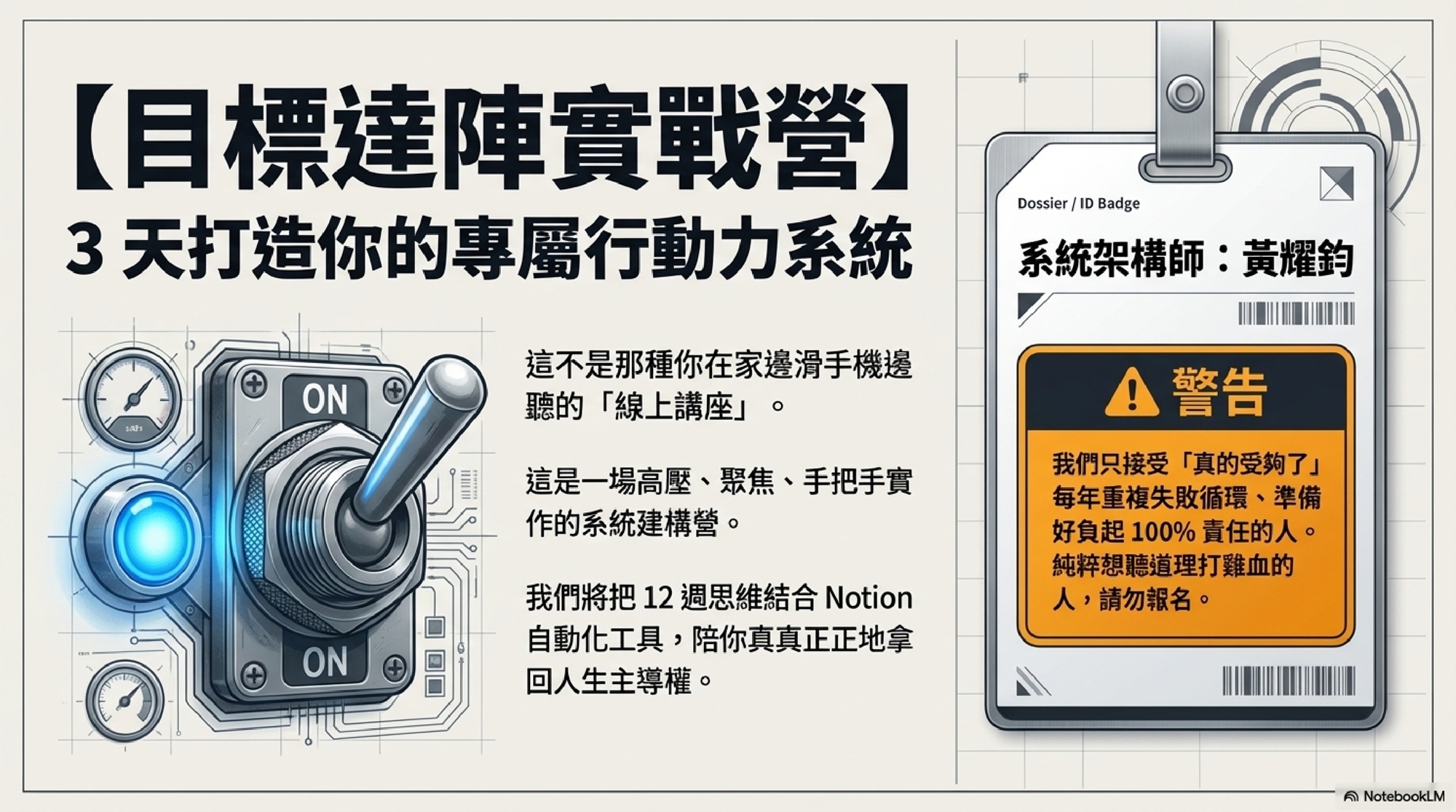 而是那種,我在網路上手把手帶領你,從大腦的思維重塑,到數位工具的落地實作,真真正正地用 3 天時間,陪你一起打造能拿回人生主導權的行動力系統。