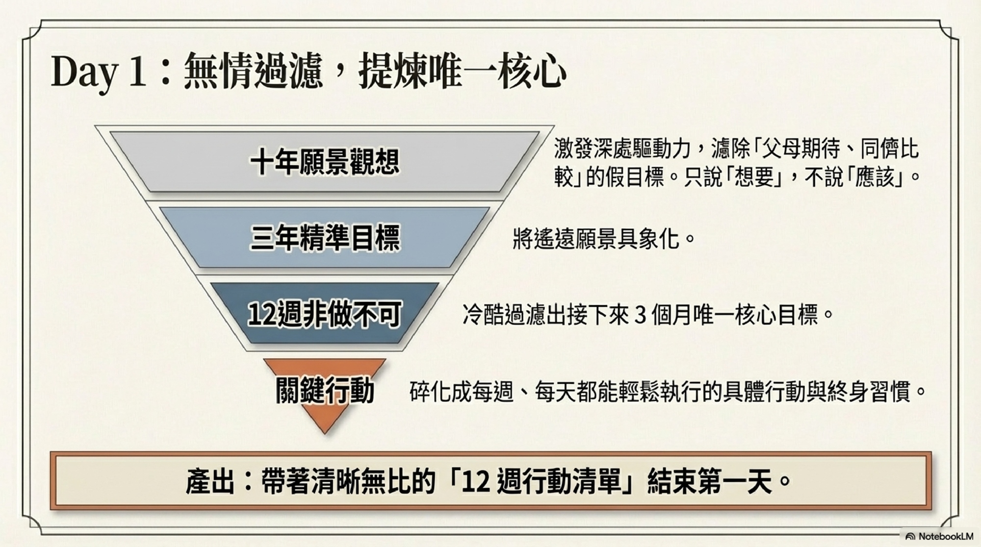 ・無情聚焦法則:將遙遠的願景,精準拆解為三年目標,再冷酷地過濾出你接下來 12 週「非做不可」的唯一核心目標 。