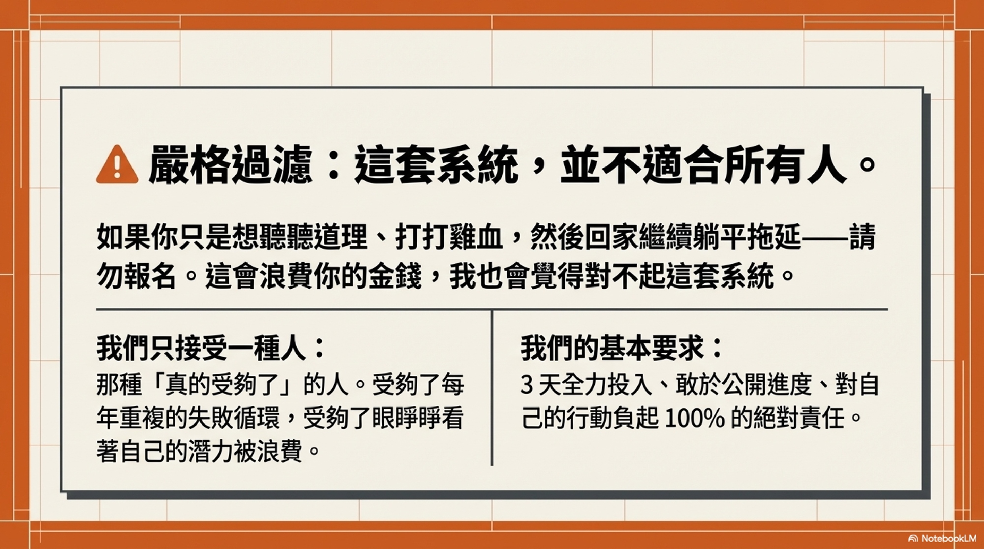 我們只接受那種「真的受夠了」的人 —— 受夠了每年重複同樣的循環,受夠了看著自己的潛力被浪費,準備好這次真的要不一樣的人。