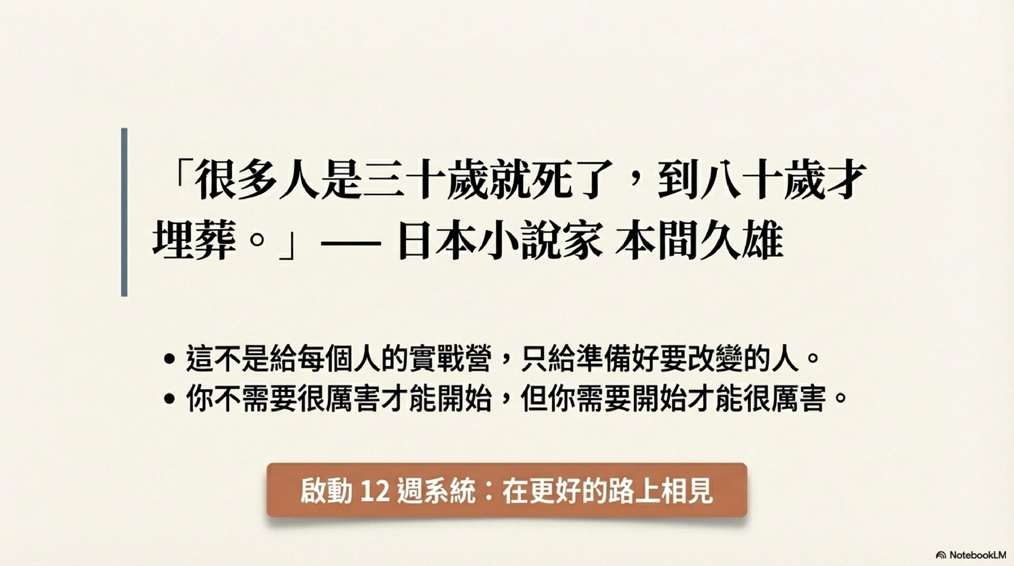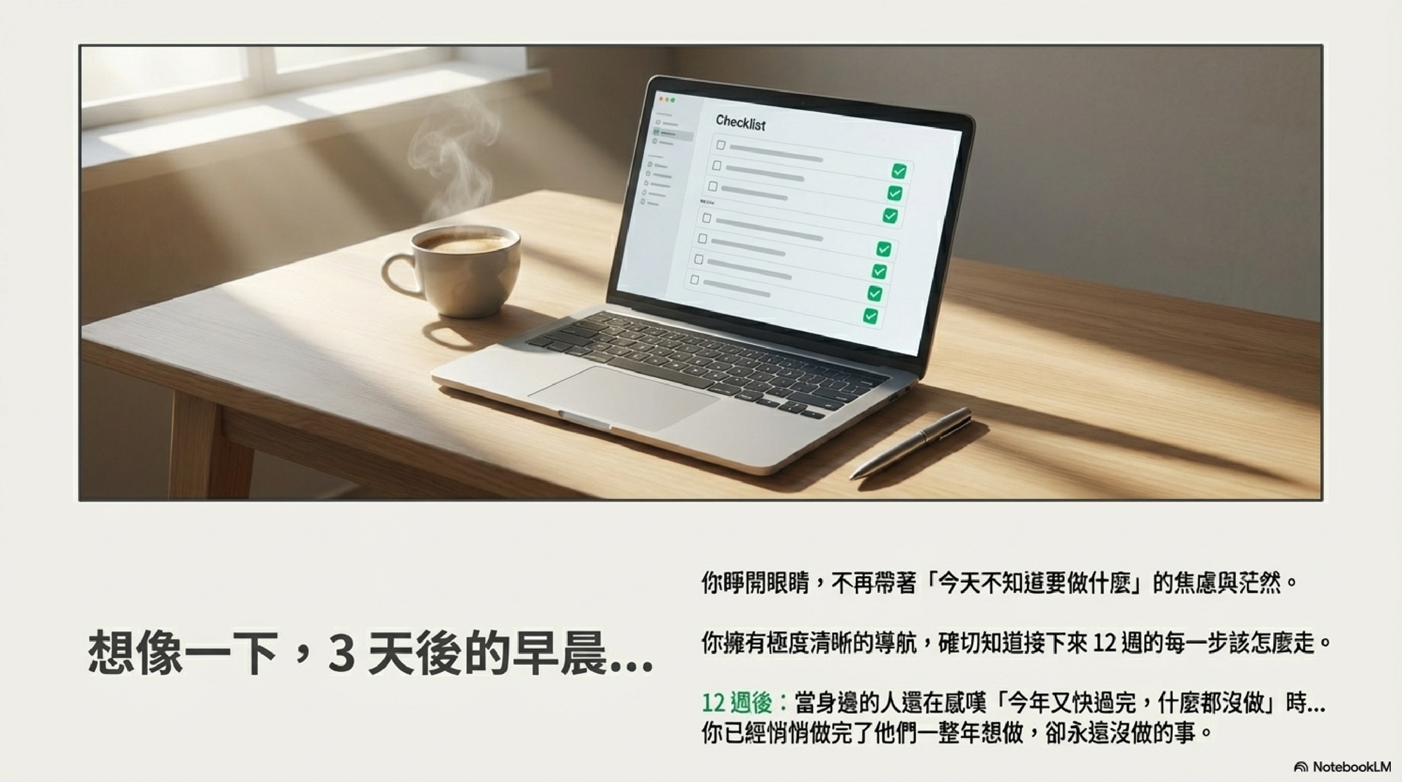 12 週後,當身邊的人還在感嘆「哎,今年又快過完了,什麼都沒做」的時候 —— 你已經悄悄做完了他們一整年想做卻沒做的事。