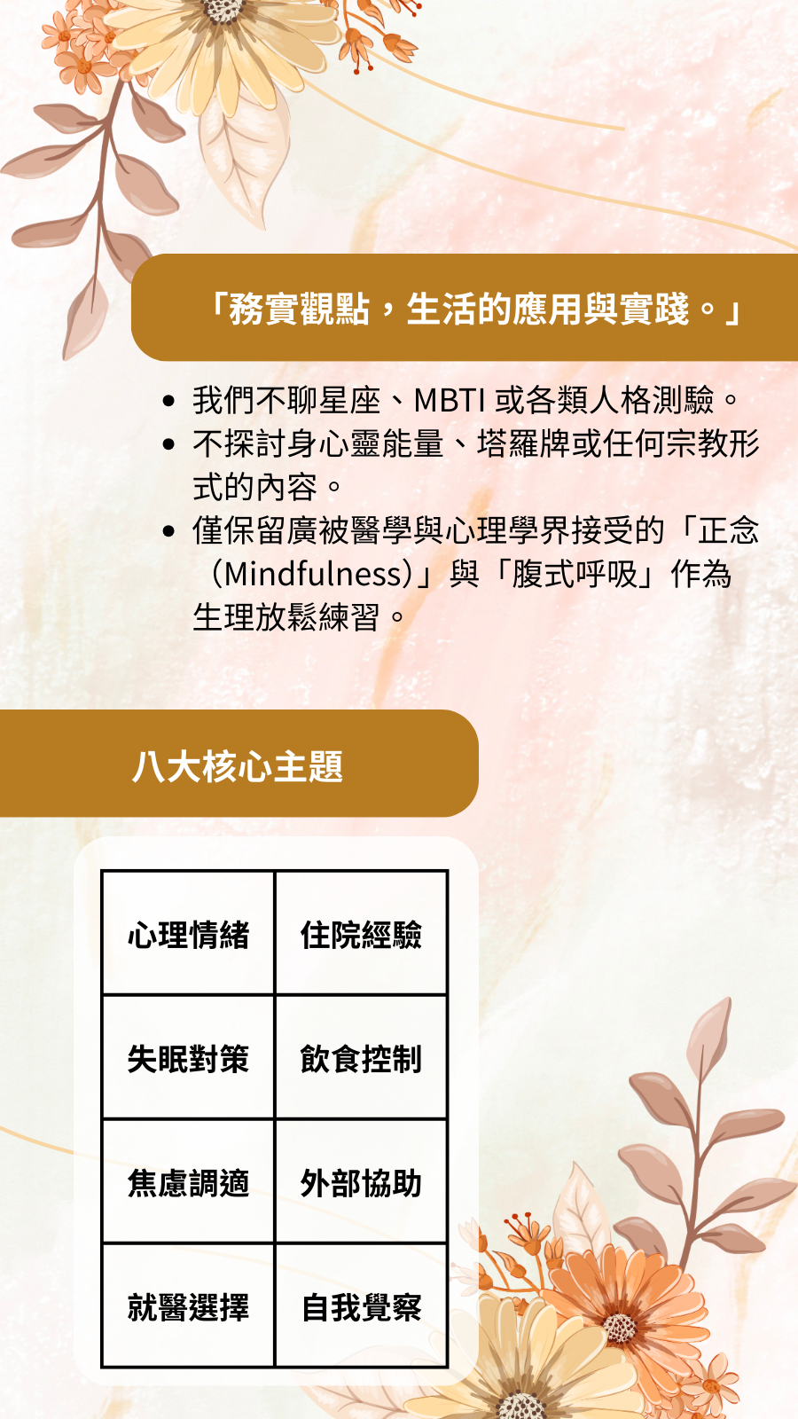 - 我們不聊星座、MBTI 或各類人格測驗。