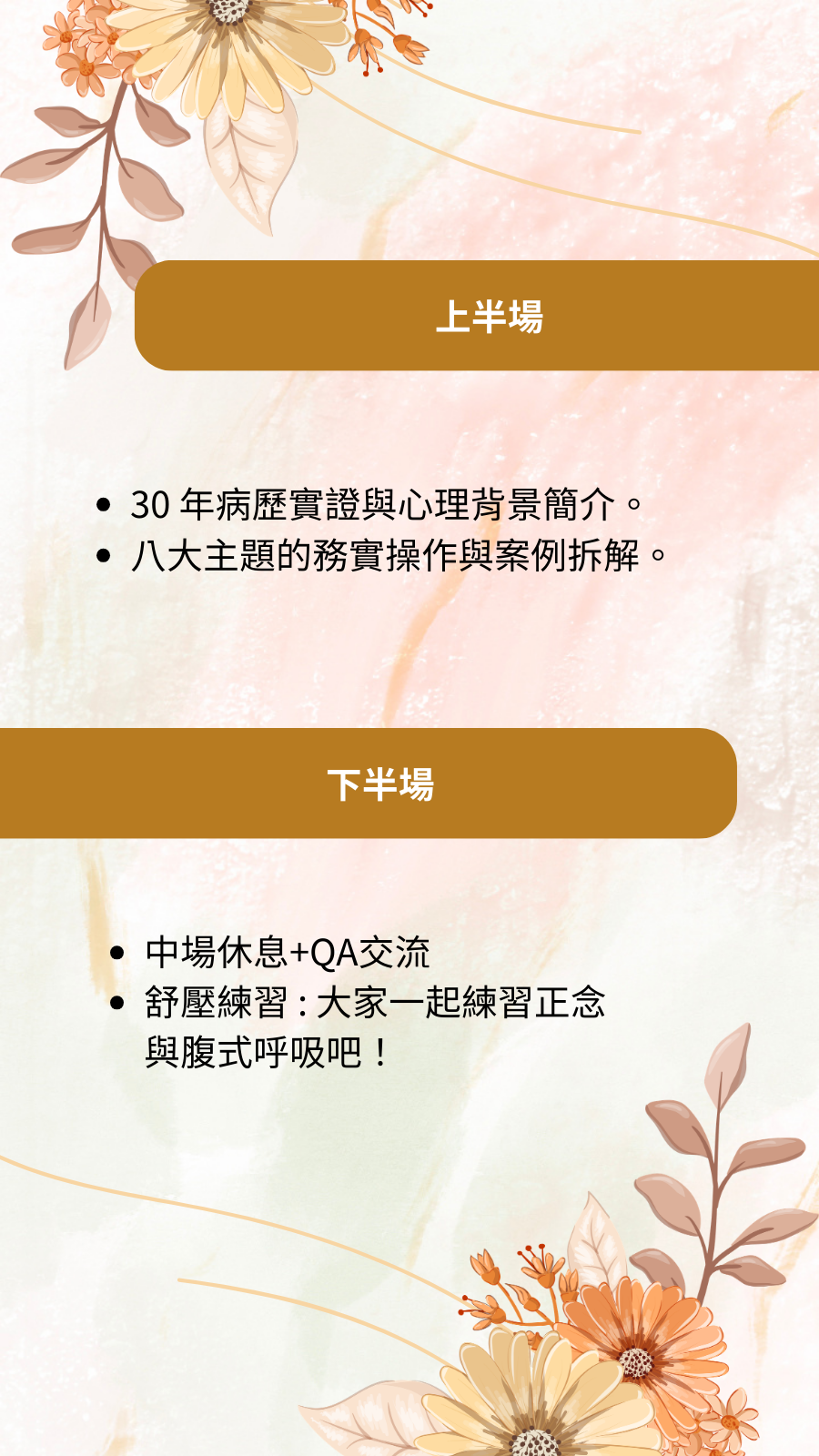 - 開場 (20分鐘): 30 年病歷實證與心理背景簡介。